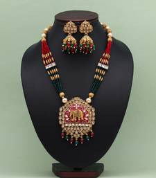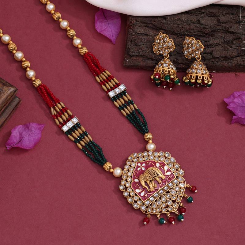 | Product Description | Adjustable Chain | Necklace Length: 42.00 Cm X Width: 2.00 Cm | Pendant Length: 9.00 Cm X Width: 6.50 Cm | Earring Length: 5.00 Cm X Width: 2.50 Cm | Metal: Alloy With Good Quality Matte Gold Plated | Color: Maroon & Green | Stone: Kundan & Beads | Gross Weight: 123.00 Grams | Package Content: 1 Piece Of Necklace/ 1 Pair Of Earring | Back Finding: Post With Friction Back X Earring Style: Jhumka |
