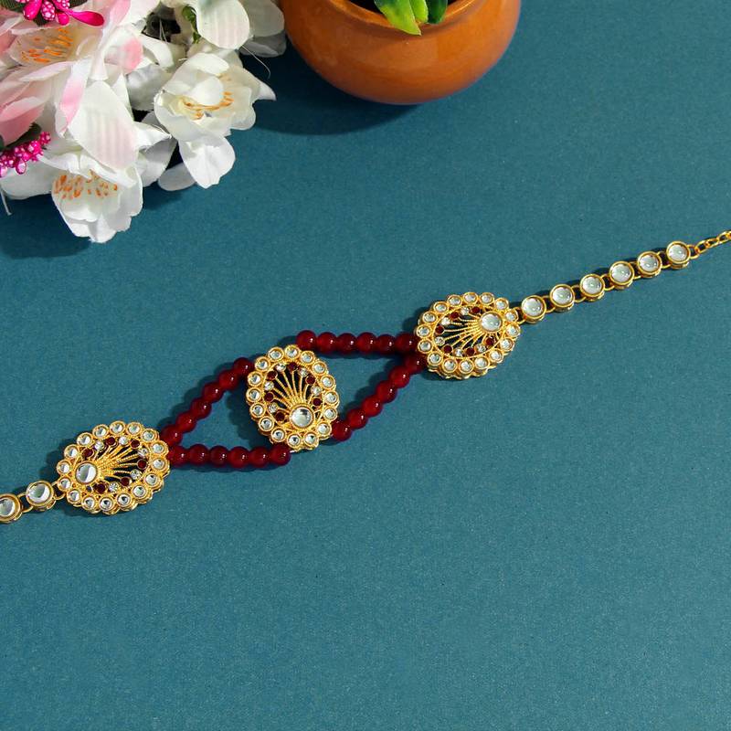 | Product Description | Adjustable Chain | Hair Band Length: 25.00 Cm X Width: 3.50 Cm | Metal: Alloy With Good Quality Gold Plated | Color: Maroon | Stone: Kundan & Imitation Pearl | Gross Weight: 60.00 Grams | Package Content: 1 Piece Of Hair Band/Chain |