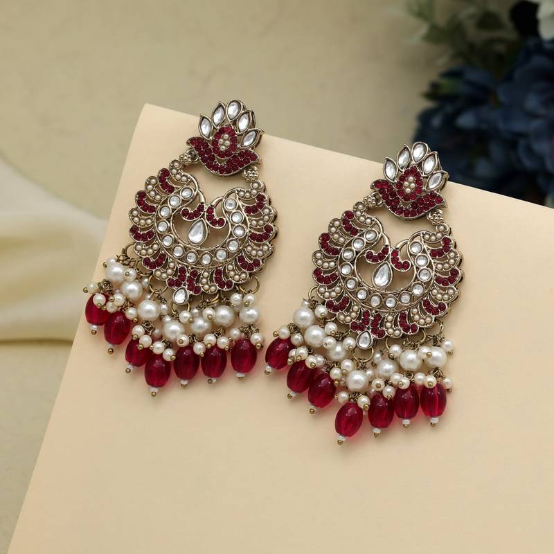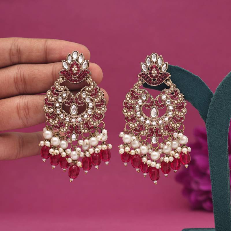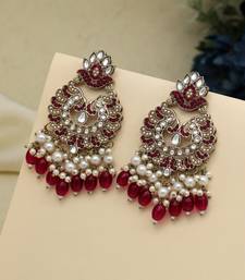 Product Description | Earring Length: 7.50 Cm X Width: 3.70 Cm | Metal: Alloy With Good Quality Mehndi Gold Plated | Color: Rani | Stone: Kundan & Imitation Pearl | Gross Weight: 32.00 Grams | Package Content: 1 Pair Of Earrings | Back Finding: Post With Friction Back X Earring Style: Dangle |