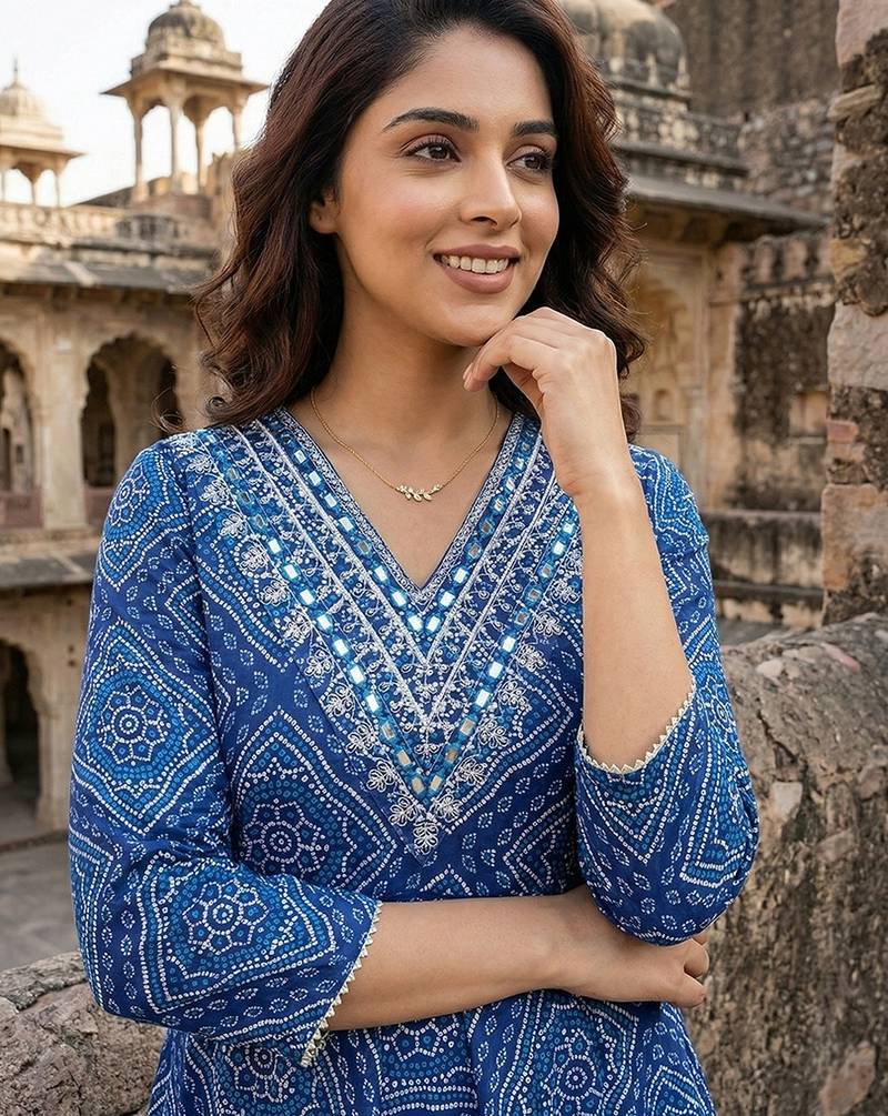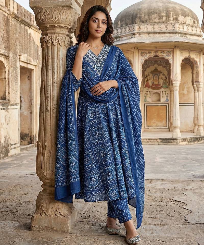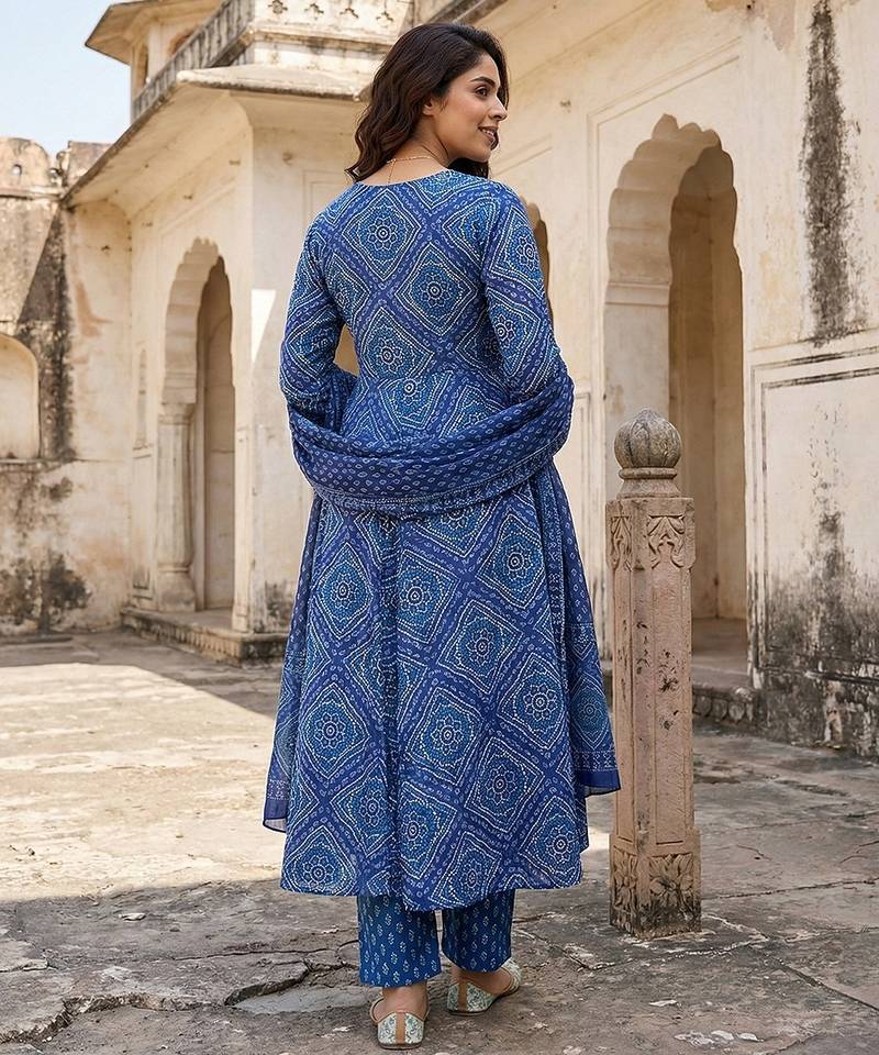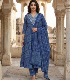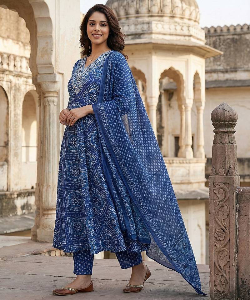 | Product Description | Anouk Blue Pure Cotton Anarkali Three Quarter Sleeves V Neck With Calf Length Geomertric Kurta Set With Dupatta |