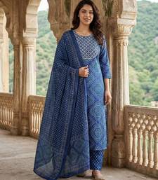 | Product Description | Anouk Blue Pure Cotton Straight Three Quarter Sleeves Round Neck With Calf Length Geomertric Kurta Set With Dupatta |