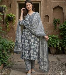 | Product Description | Anouk Grey Pure Cotton Straight Three Quarter Sleeves V Neck With Calf Length Floral Print Kurta Set With Dupatta |