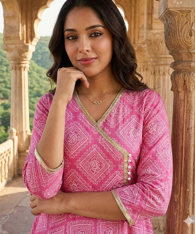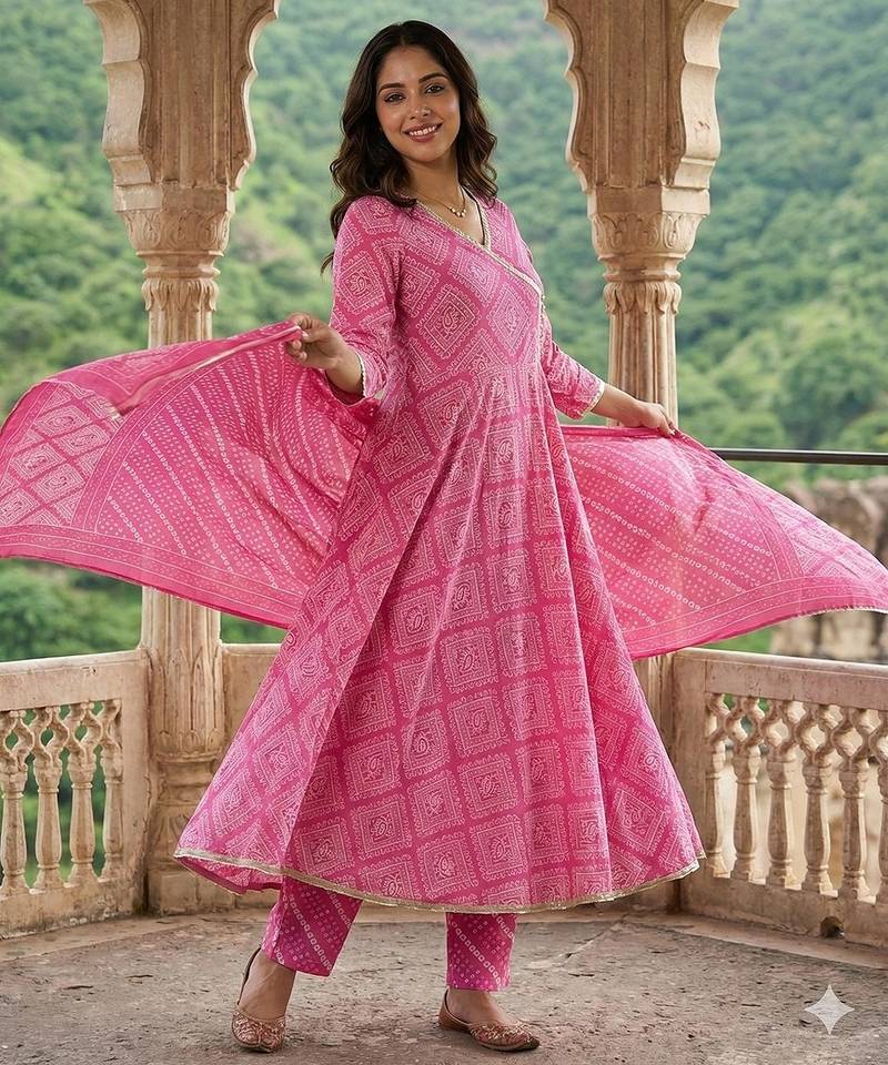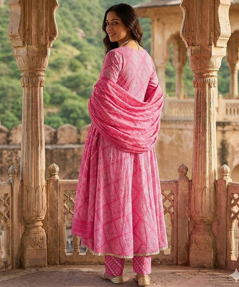 | Product Description | Anouk Pink Pure Cotton Anarkali Three Quarter Sleeves V Neck With Calf Length Bandhani Print Kurta Set With Dupatta |