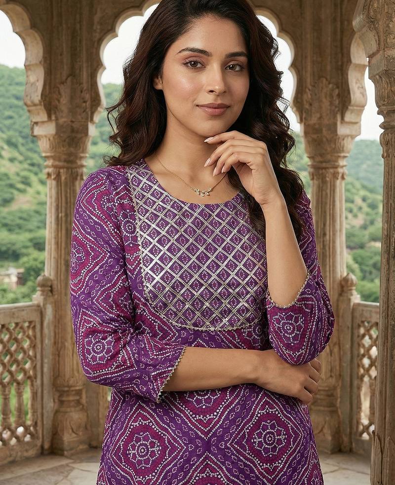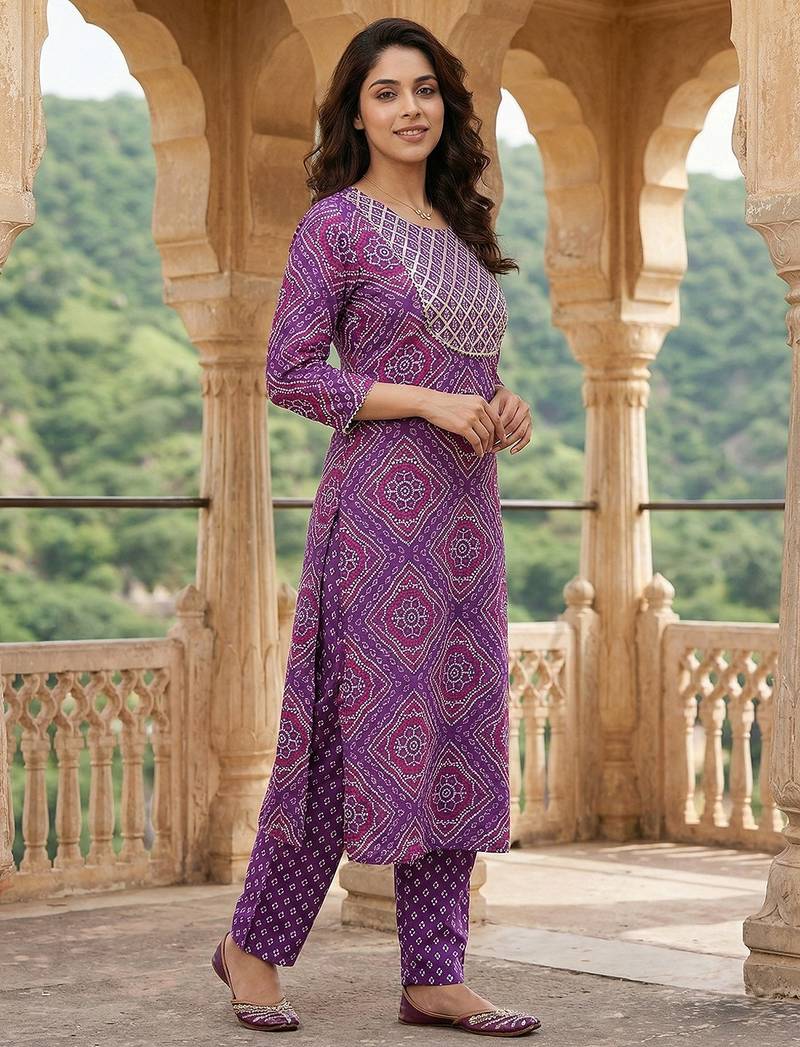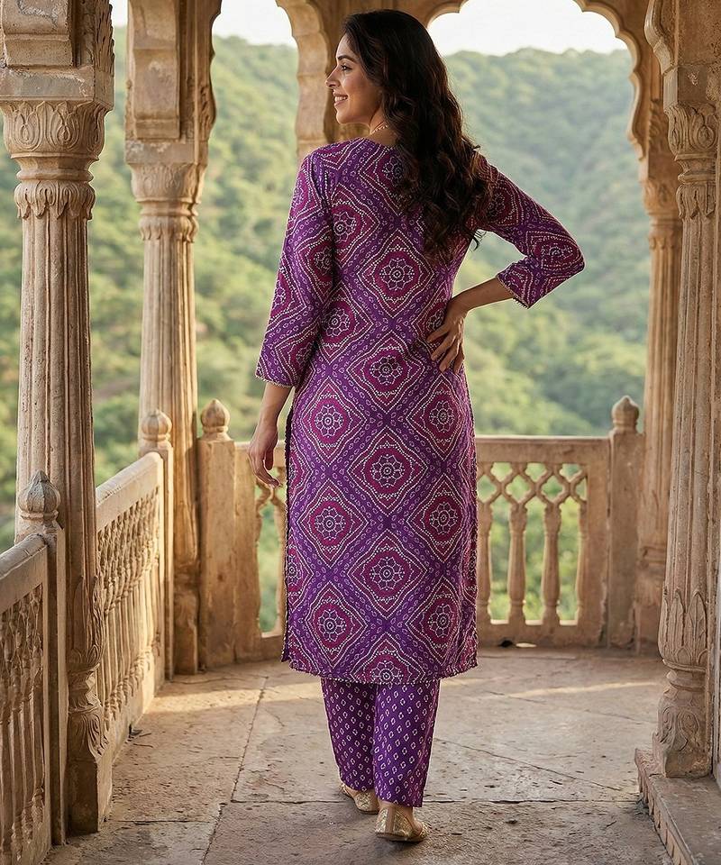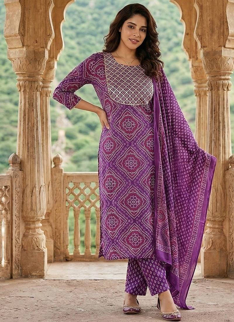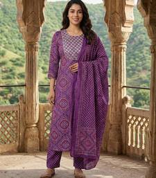 | Product Description | Anouk Purple Pure Cotton Straight Three Quarter Sleeves Round Neck With Calf Length Geomertric Kurta Set With Dupatta |