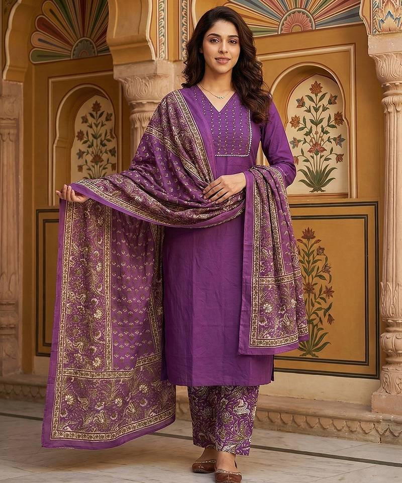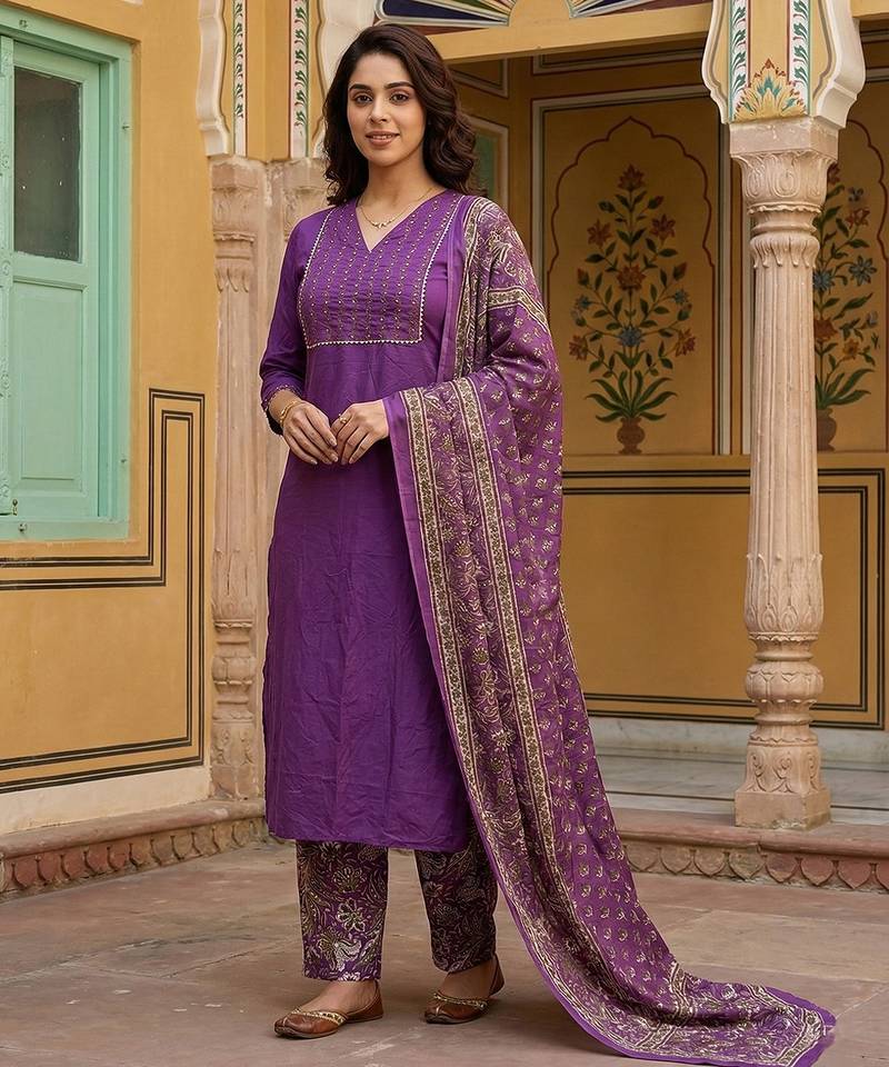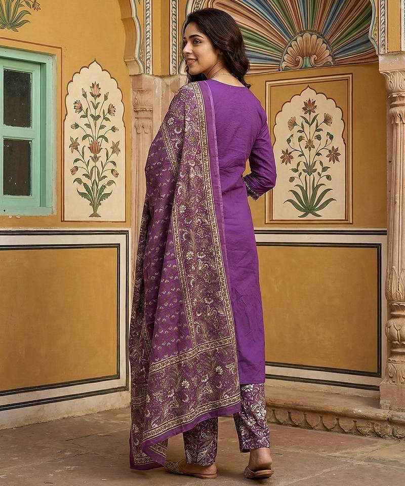 | Product Description | Anouk Purple Pure Cotton Straight Three Quarter Sleeves V Neck With Calf Length Solid Kurta Set With Dupatta |