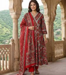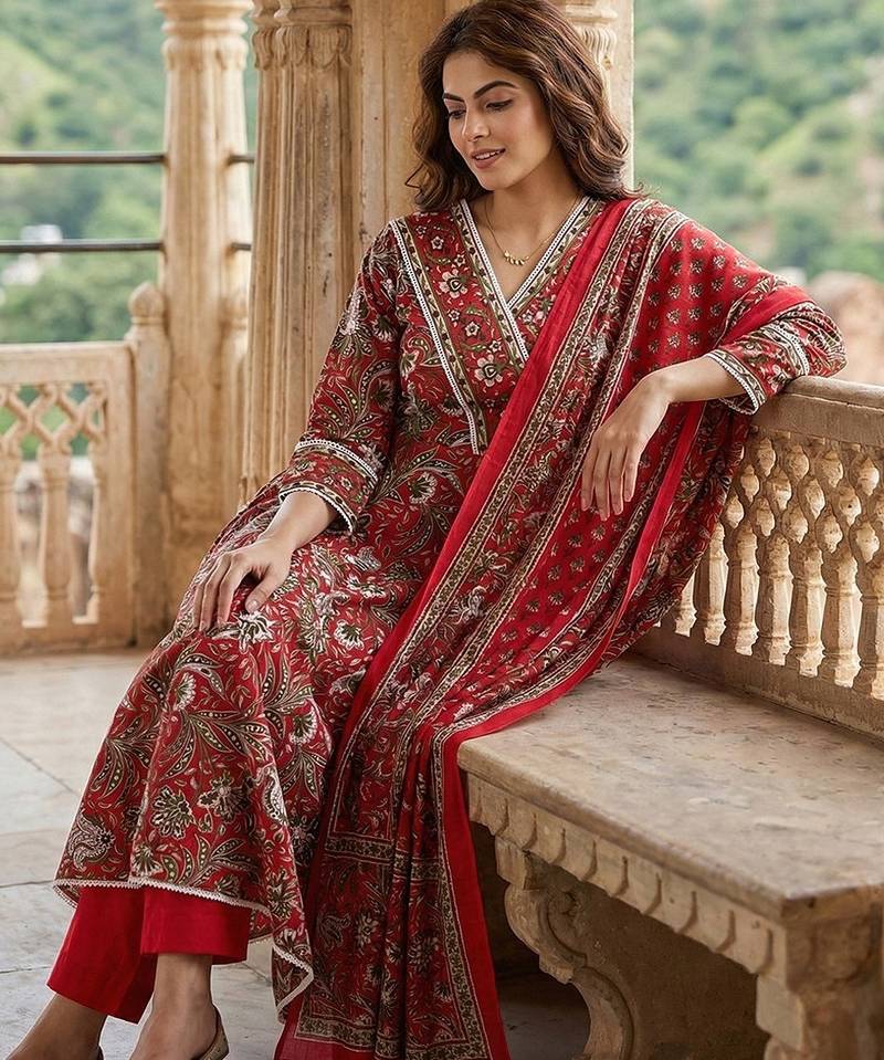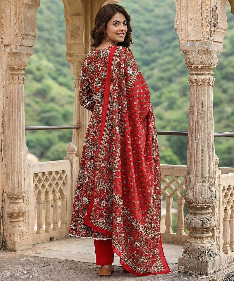| Product Description | Anouk Red Pure Cotton Anarkali Three Quarter Sleeves V Neck With Calf Length Floral Print Kurta Set With Dupatta |