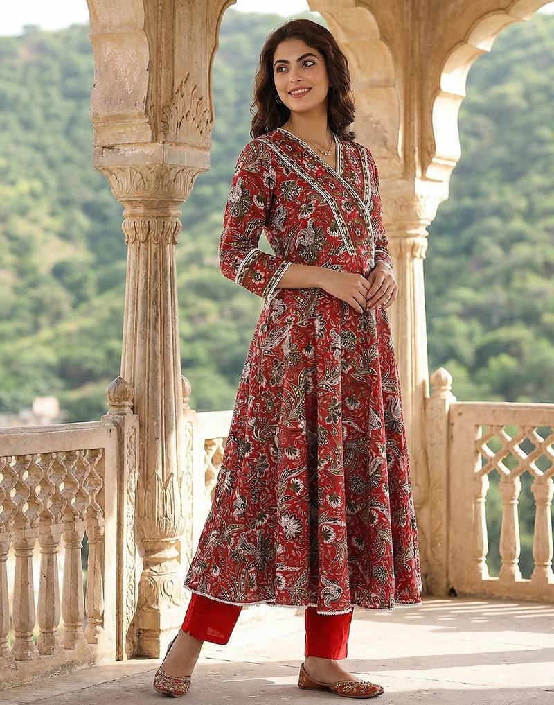 Anouk red pure cotton anarkali angrakha kurta set