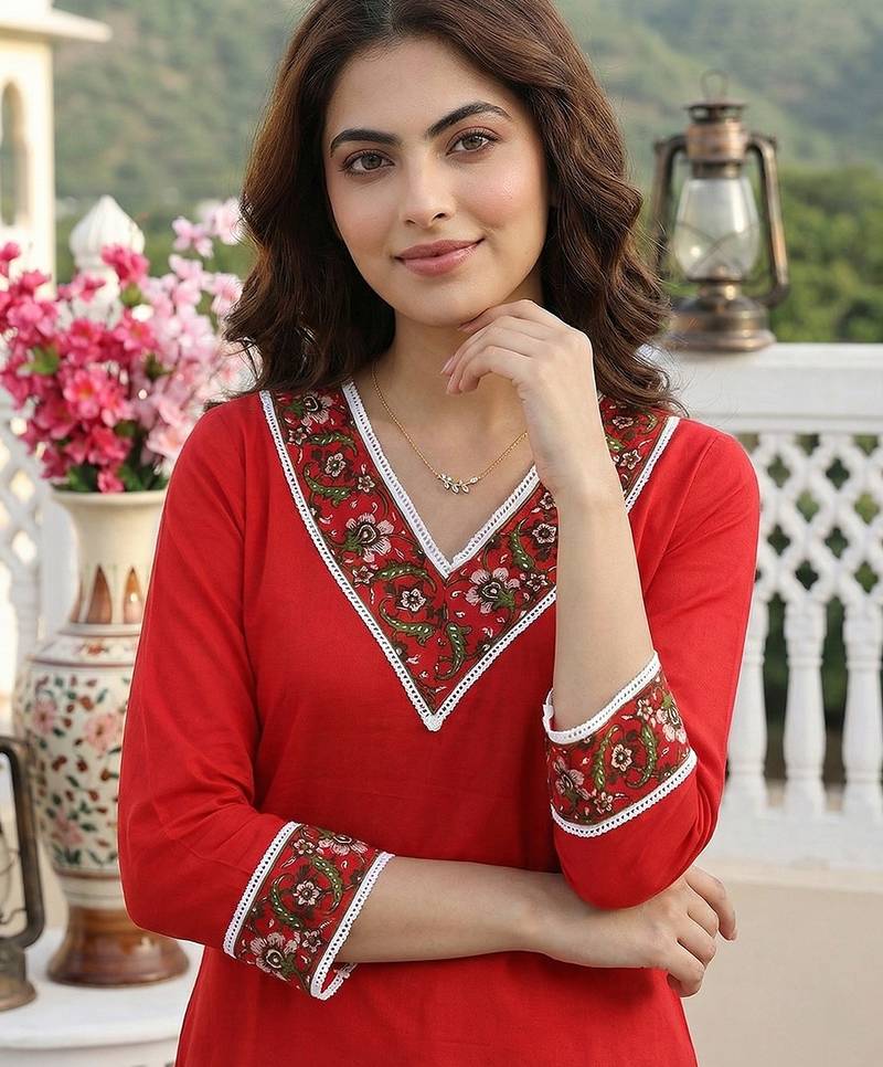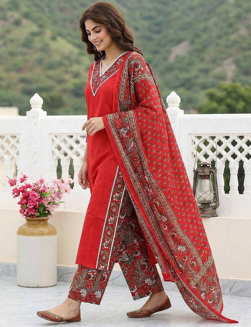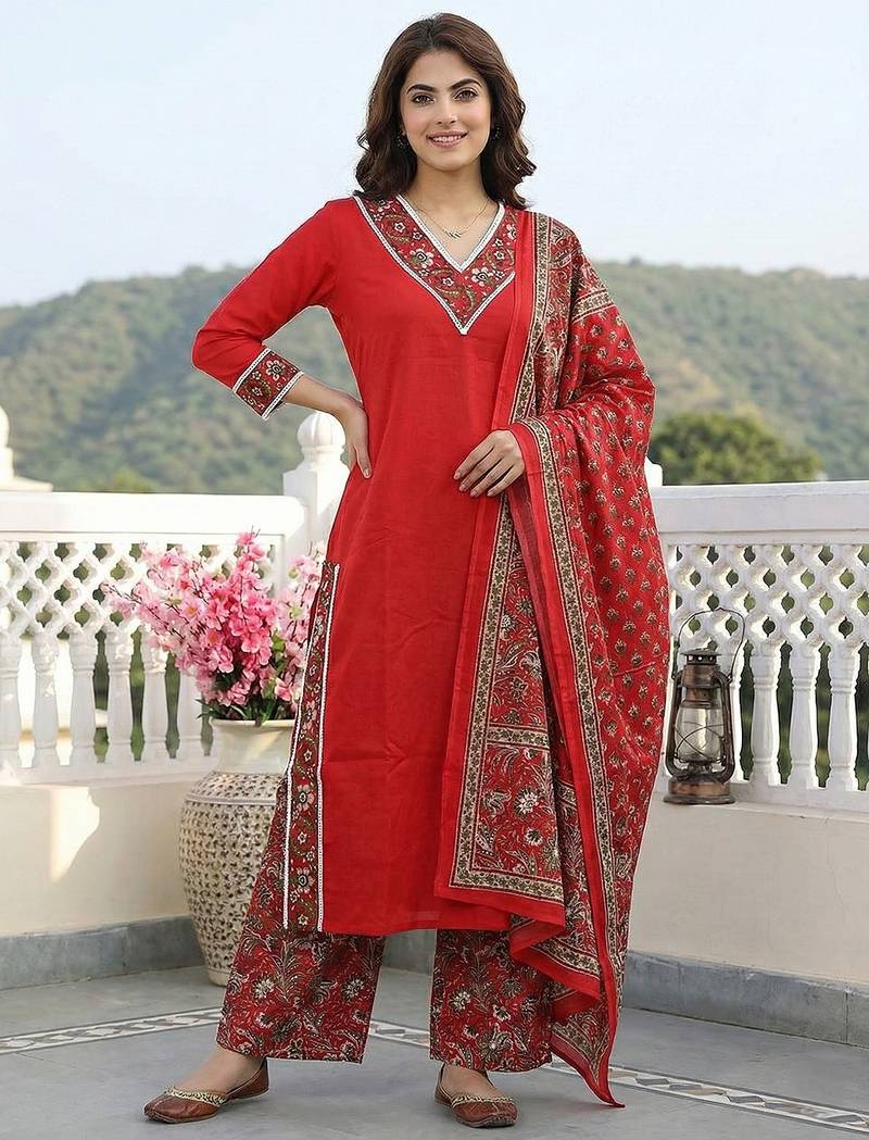 | Product Description | Anouk Red Pure Cotton Straight Three Quarter Sleeves V Neck With Calf Length Solid Kurta Set With Dupatta |