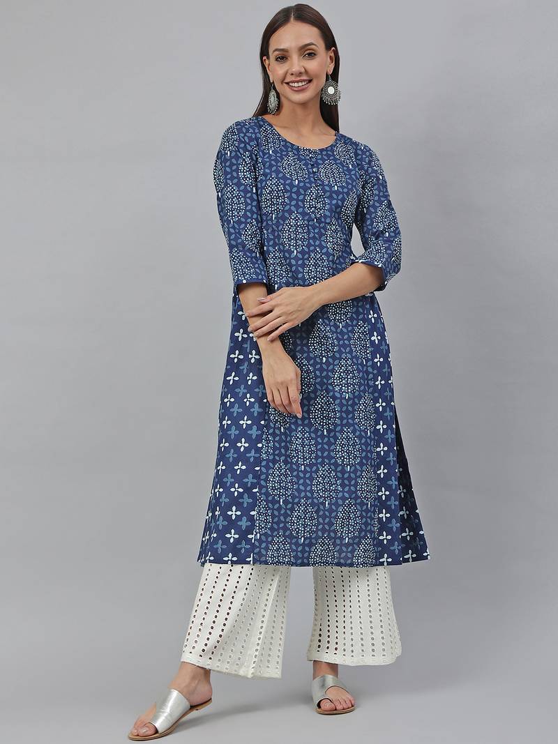 | Product Description | This Blue Printed Kurti Is Made In Natural Cotton, Soft Fabric That Is Comfortable To The Skin. It Features Round Neck, 3/4 Sleeves , Calf Length And A Line Silhoutte. Style With Pants And Mojri To Complete The Look. |