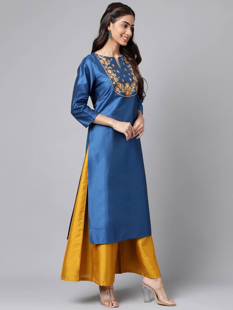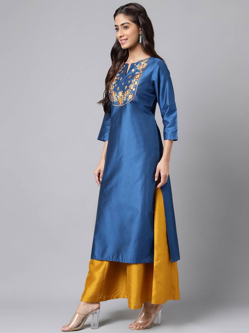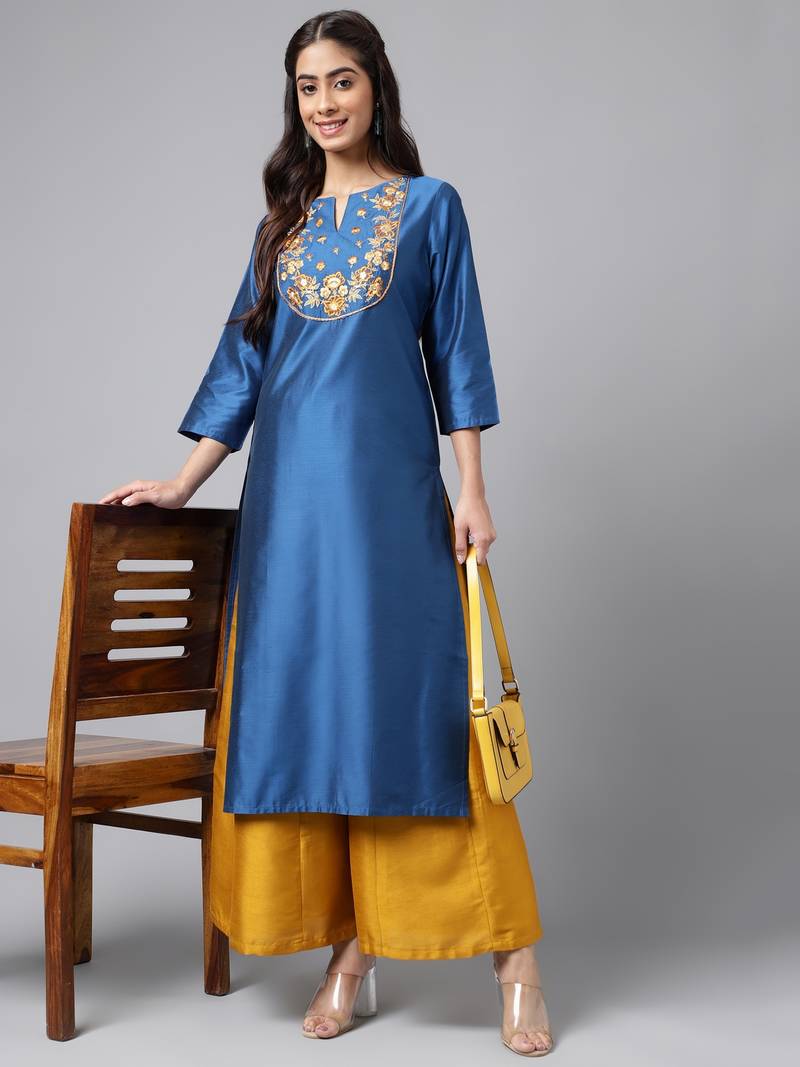 | Product Description | This Stylish Blue Ethnic Wear Calf Length Kurta, Designed To Give You A Stunning Look For Any Occasion. Made With High Quality Fabric, This Kurta Is Not Only Comfortable But Also Durable. The Straight Silhouette And 3/4th Sleeves Add A Touch Of Sophistication To The Outfit, While The Intricate Threadwork Embroidery On The Notch Neck Yoke Makes It Stand Out. The Blue Color Is Both Trendy And Classic, Making It A Versatile Addition To Your Wardrobe. This Kurta Is Perfect For Any Festive Occasion. So, Elevate Your Style Game With This Gorgeous Piece And Get Ready To Make A Statement. |