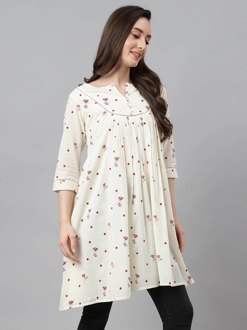 | Product Description | Style Effortlessly In This Off White Cambric Cotton Botanical Print Flared Tunic By Janasya Crafted In Cambric Cotton Fabric Featuring Combination Of Floral Prints And Polka Prints All Over, Notch Neck With Lace Detailing And Shell Buttons At The Yoke, 3/4 Regular Sleeves With Lace Detailing And Flared Silhouette. The Tunic Includes Mul Cotton Lining. |