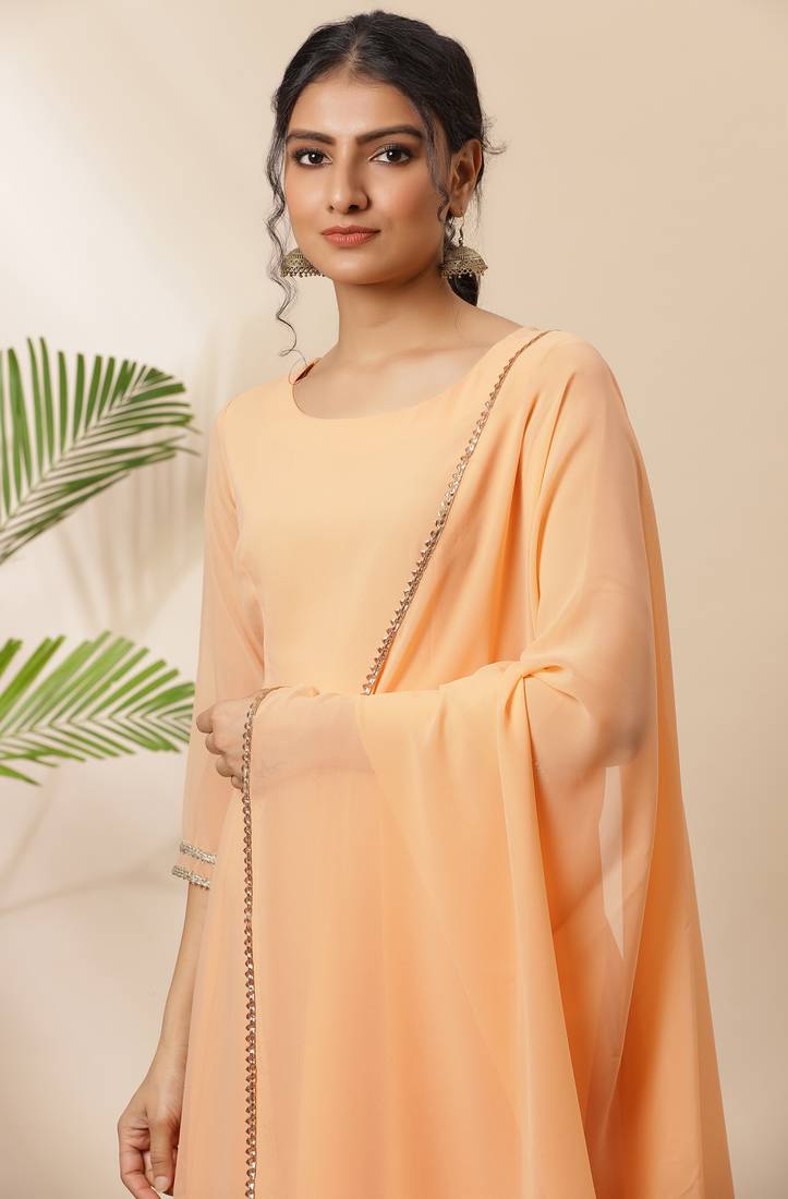 | Product Description | Janasya Women's Solid 3/4 Sleeve Crepe Lined Peach Poly Georgette Flared Kurta With Solid Peach Georgette Dupatta |