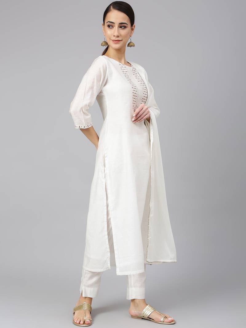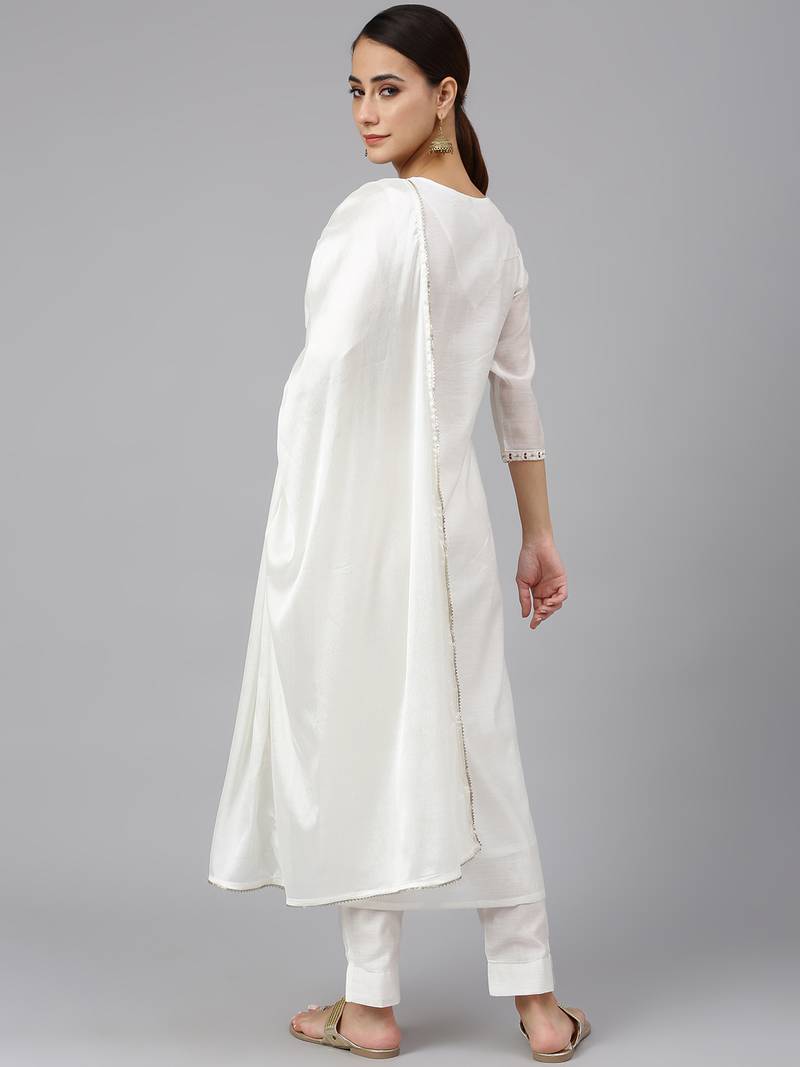 | Product Description | Janasya Is Here To Serve You This White Chanderi Silk Kurta Set. It Features Straight Kurta, Round Neck, 3/4 Sleeves And Has Embroidery Detailing On Yoke. It Comes Along With Pants And Beautiful Dupatta Which Enhance The Whole Look. Team It Up With Minimal Accessories To Complete The Look. |