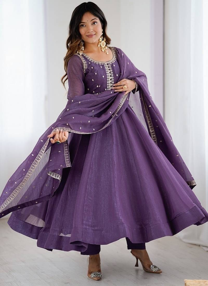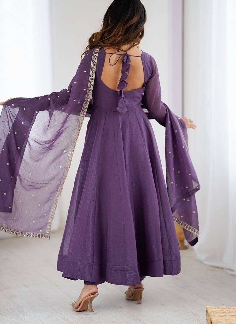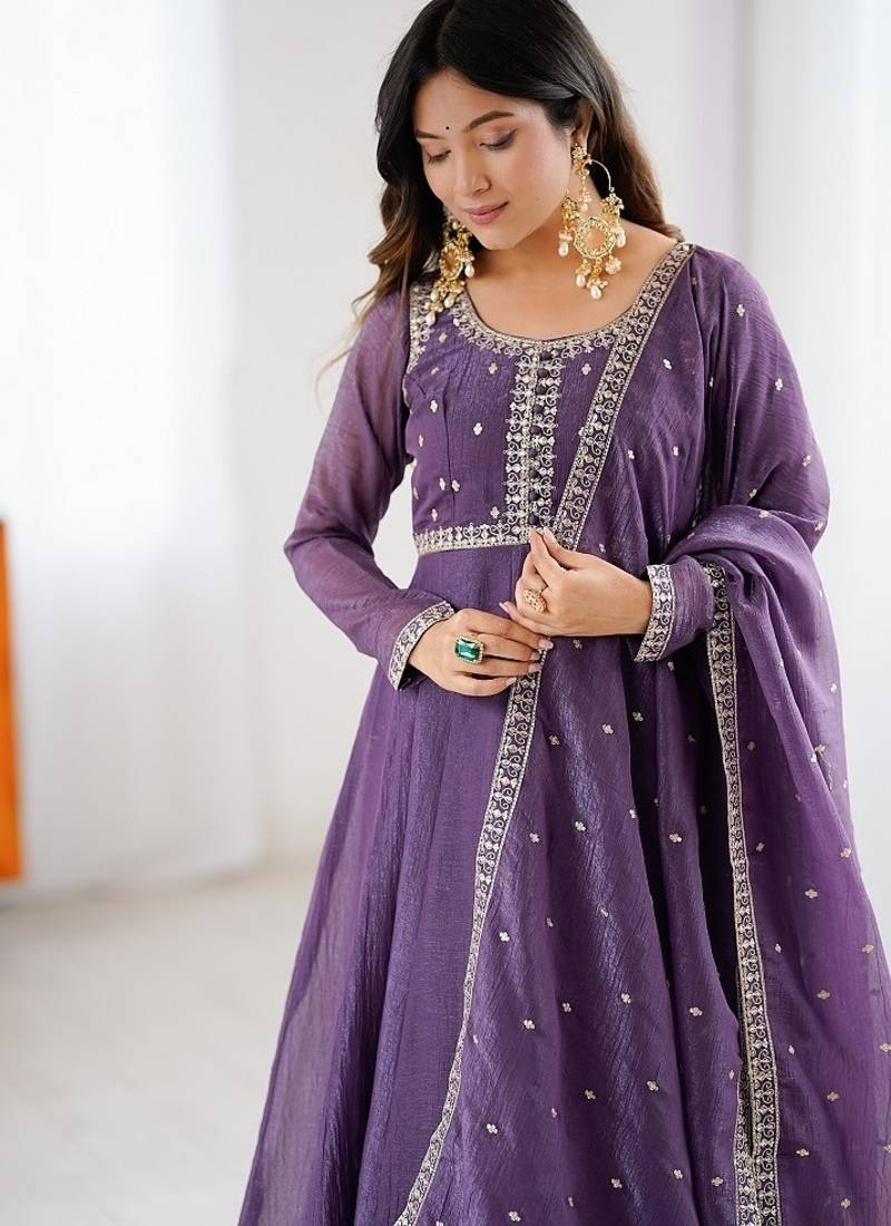 Lavender crunchy silk with embroidered zari dori work anarkali set stitched