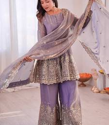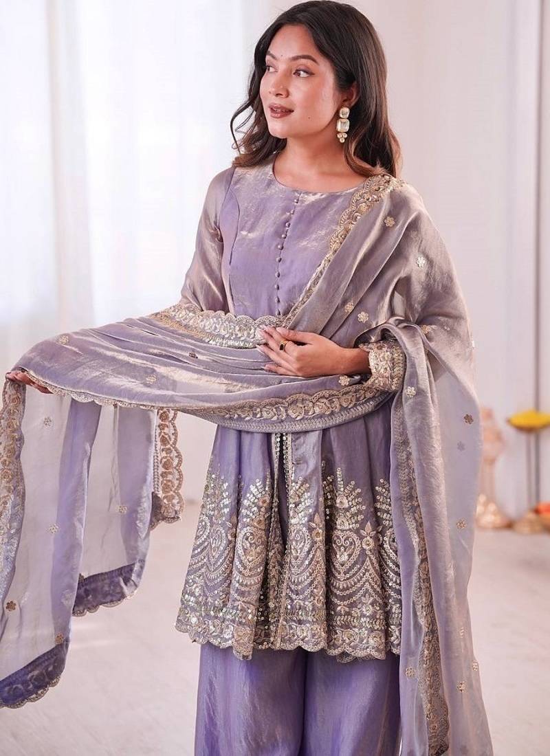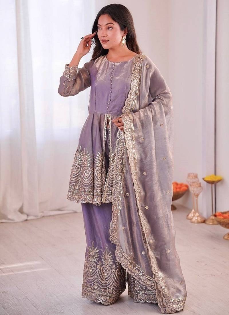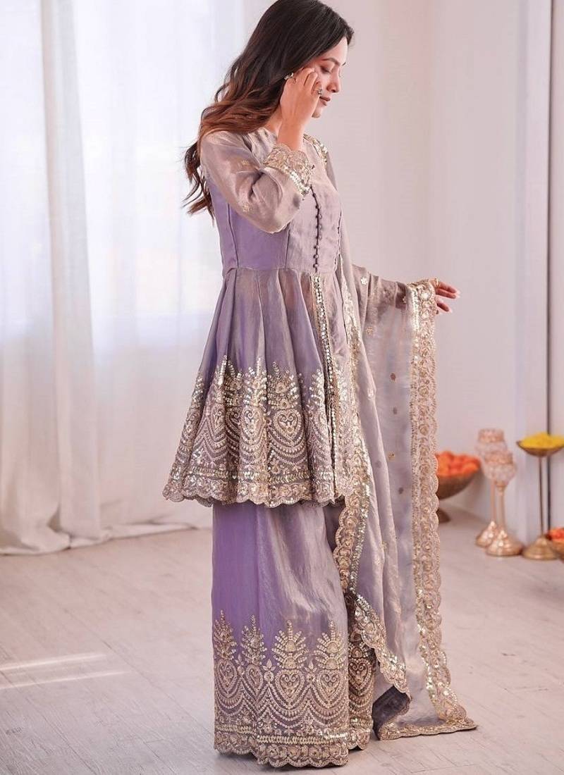 Lavender fendy satin with embroidered real mirror work plazzo set stitched