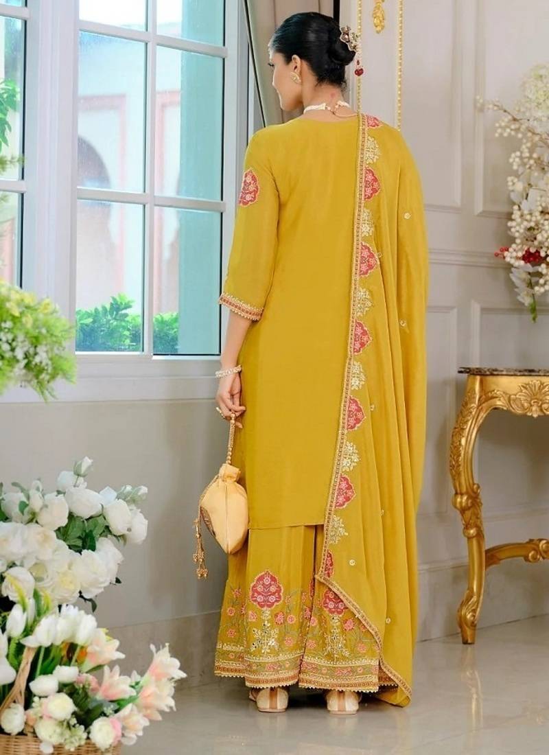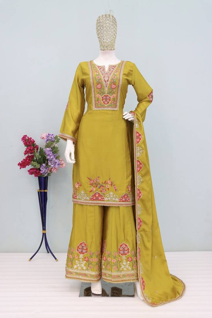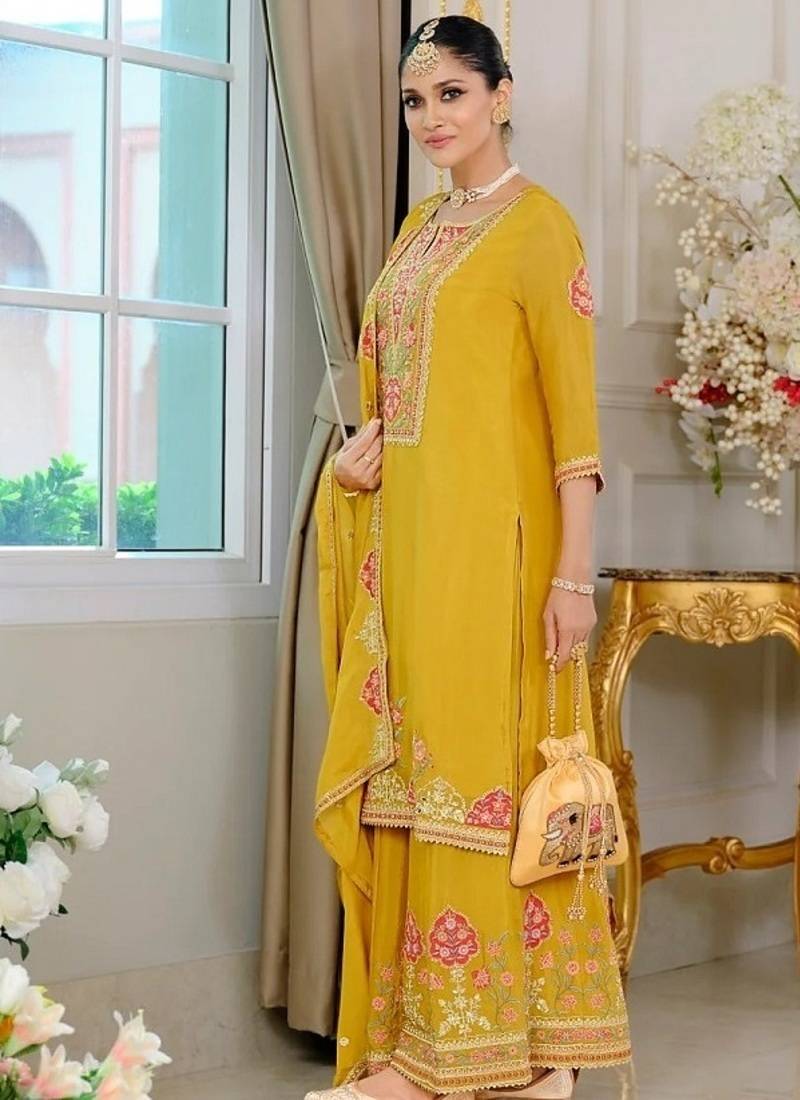 Luxury wedding yellow embroidered kurta palazzo set stitched