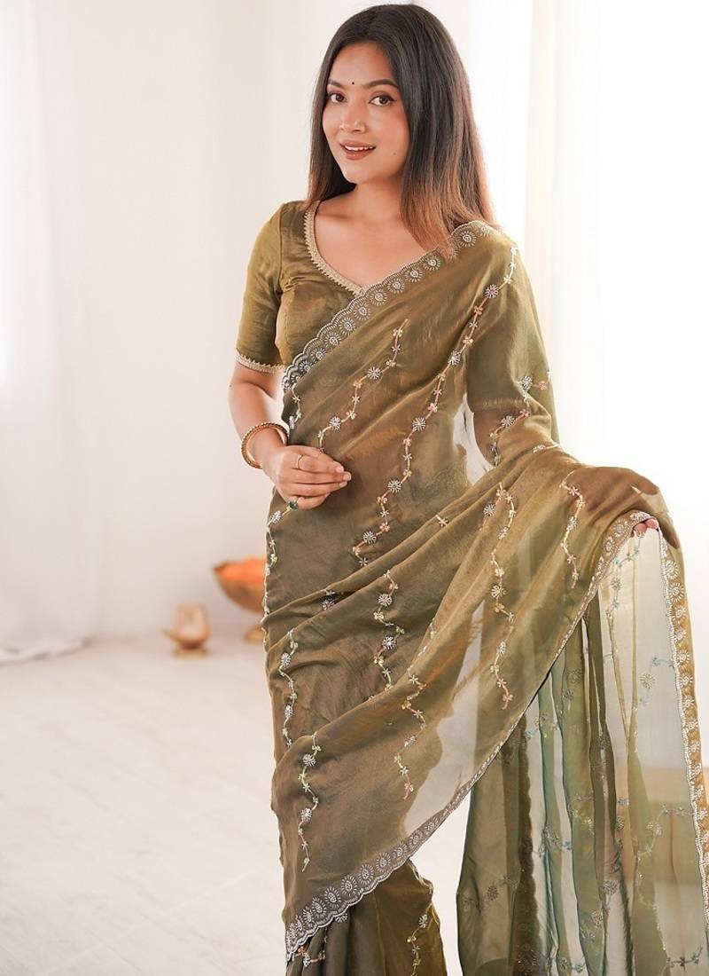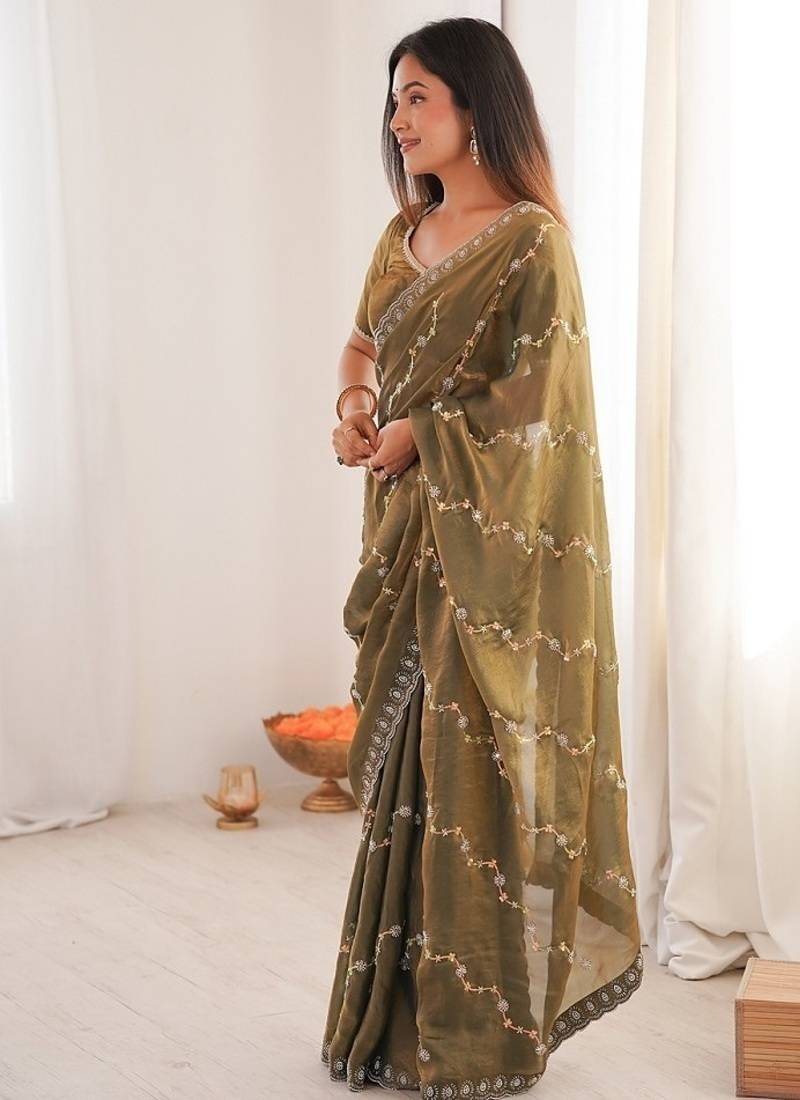 Mehendi fendy satin with beads embroidered work with stone border work saree with unstitched blouse
