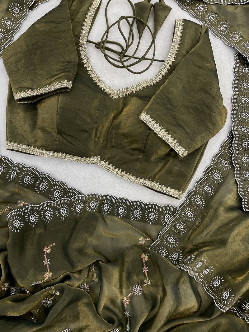 Mehendi fendy satin with beads embroidered work with stone border work saree with unstitched blouse