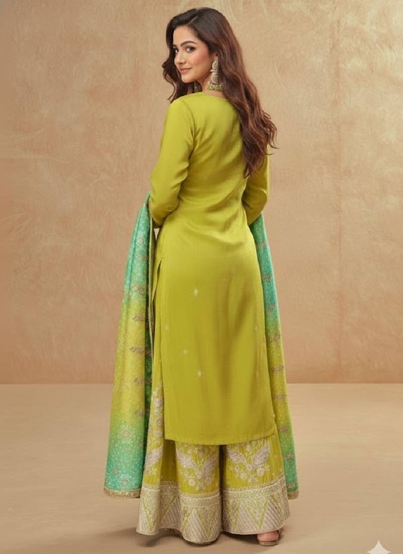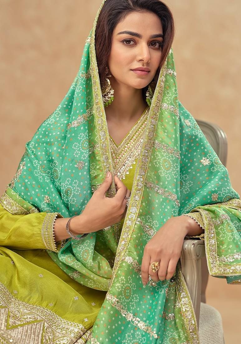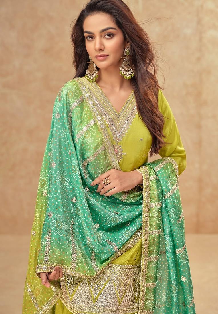 | • | Dupatta | : | Color- Parrot Green / Fabric- Silk Blend |