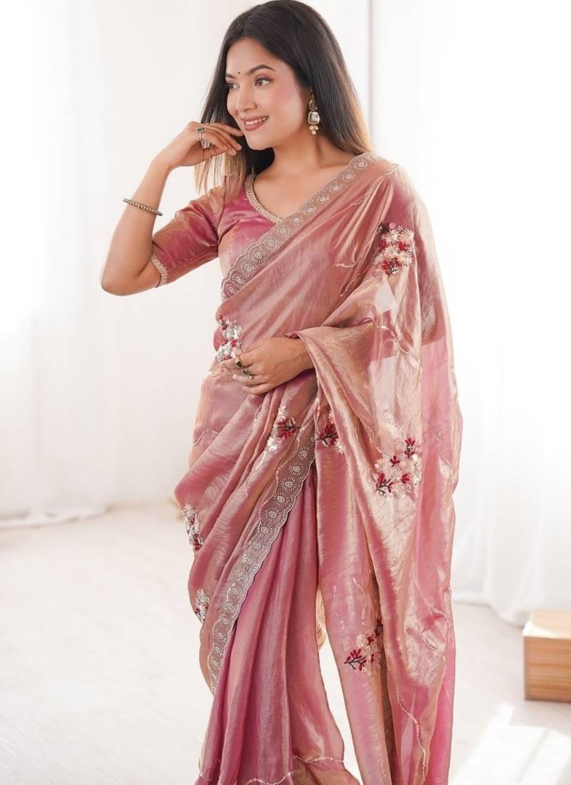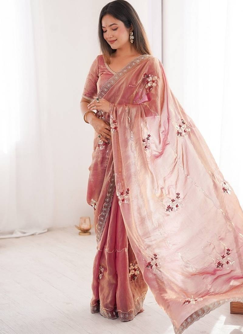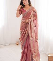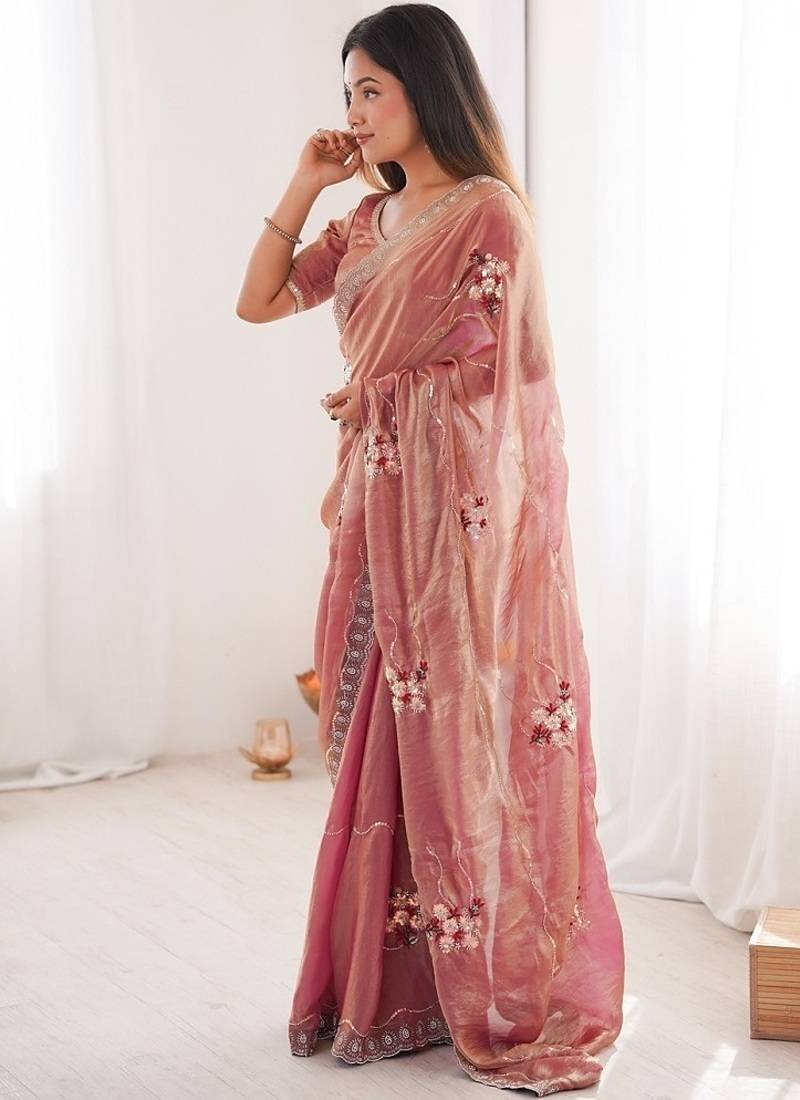 Peach fendy satin with beads embroidered work with stone border work saree with unstitched blouse