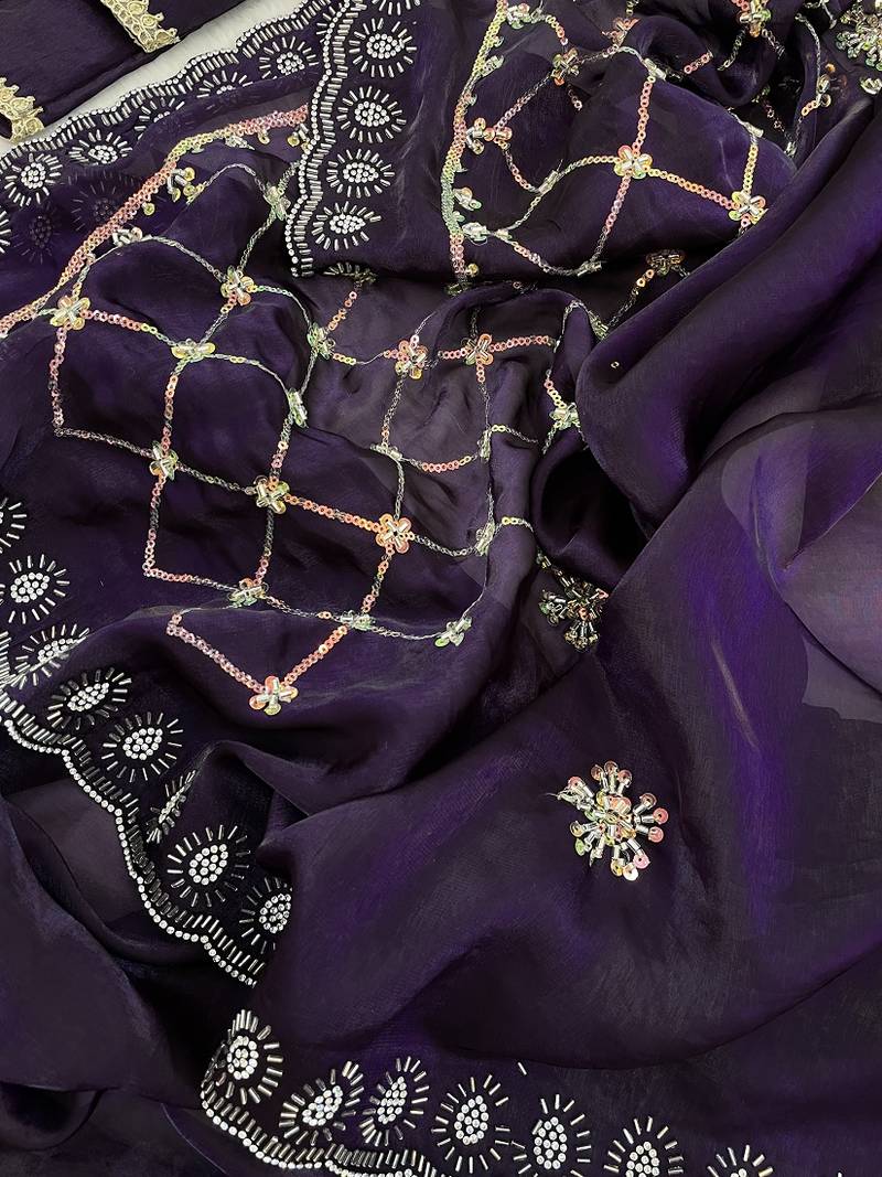 | Product Name | Purple Fendy Satin With Beads Embroidered Work With Stone Border Work Saree With Unstitched Blouse | |