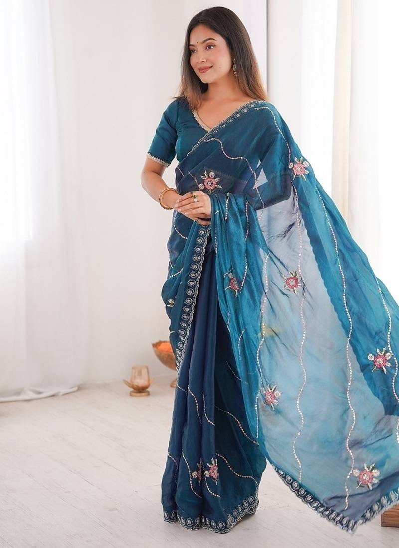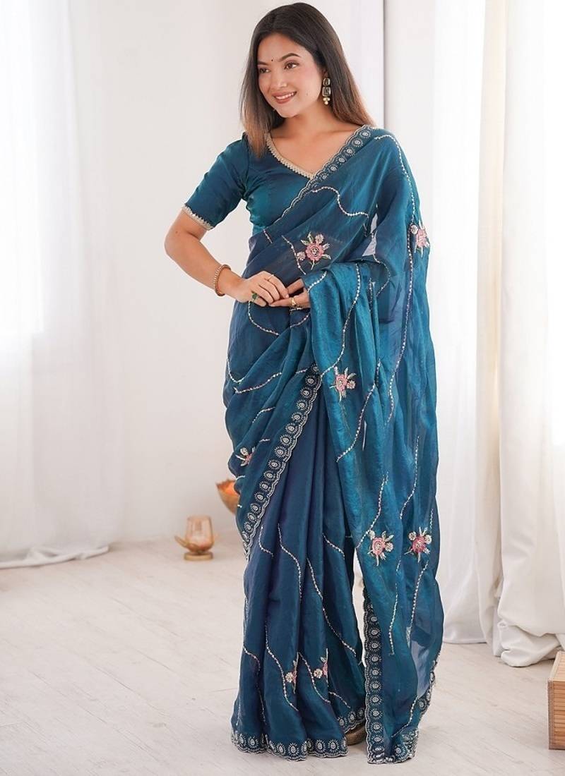 | • | Saree | : | Color- Teal / Fabric- Silk Blend |