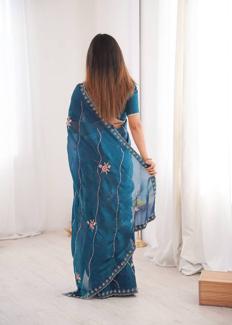Rama fendy satin with beads embroidered work with stone border work saree with unstitched blouse