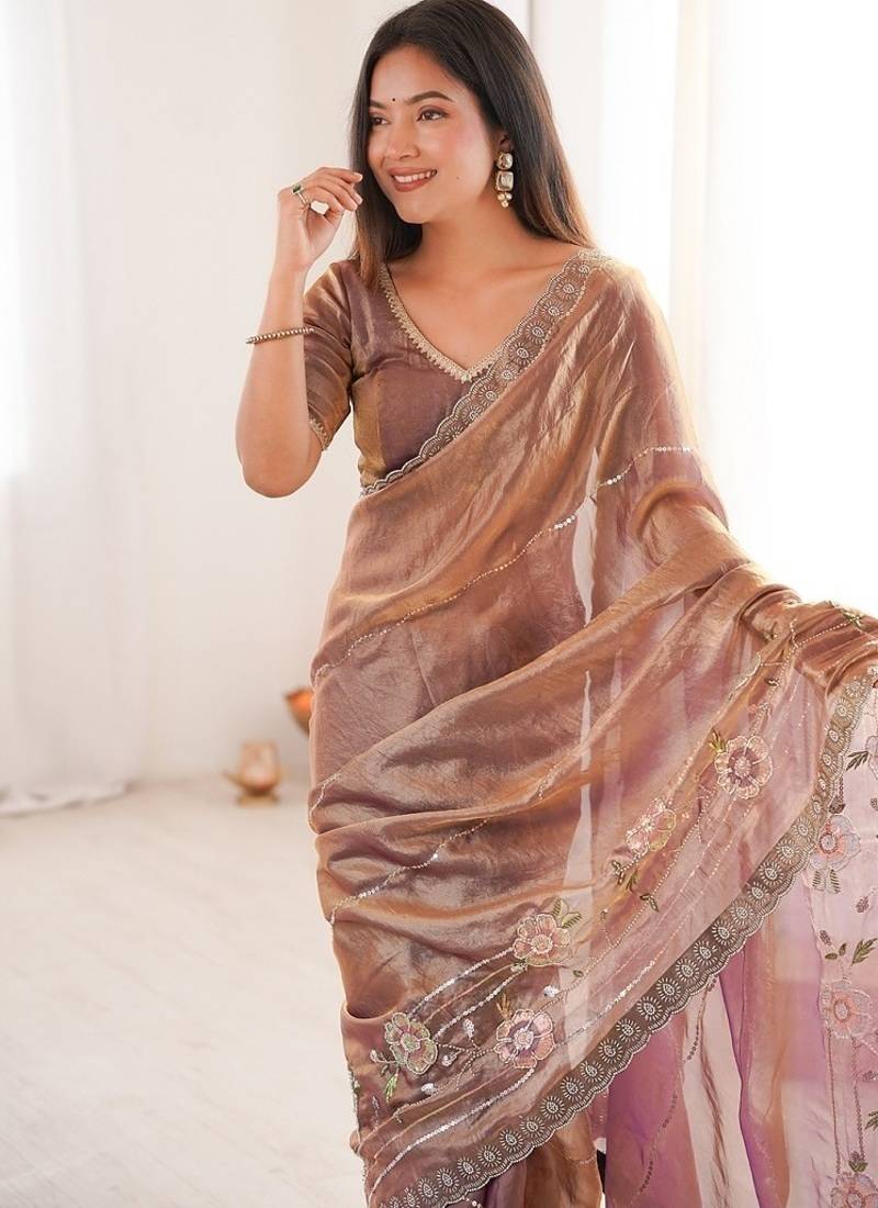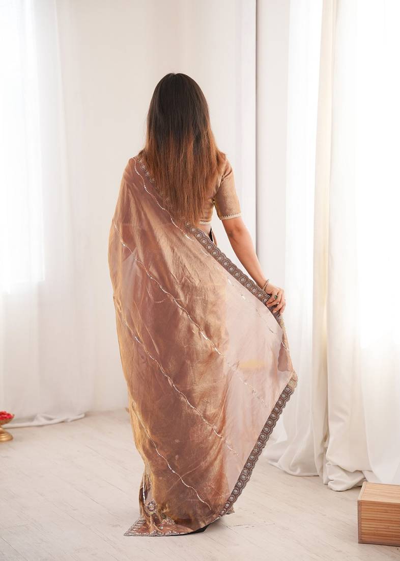 Rust fendy satin with beads embroidered work with stone border work saree with unstitched blouse