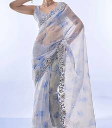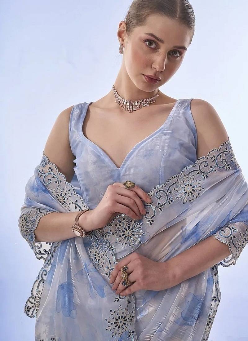 Skyblue soft space silk blend with printed and coding sequence work saree with unstitched blouse