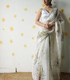 White soft tabby silk blend printed with beads work saree with unstitched blouse