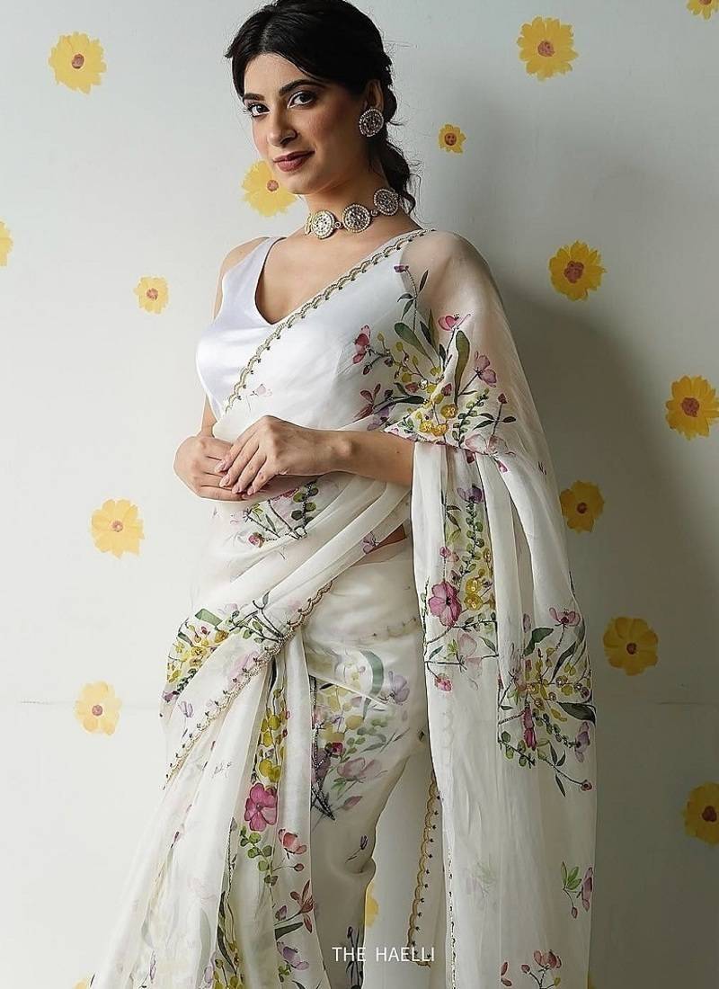 Product Name | White Soft Tabby Silk Blend Printed With Beads Work Saree With Unstitched Blouse | |
