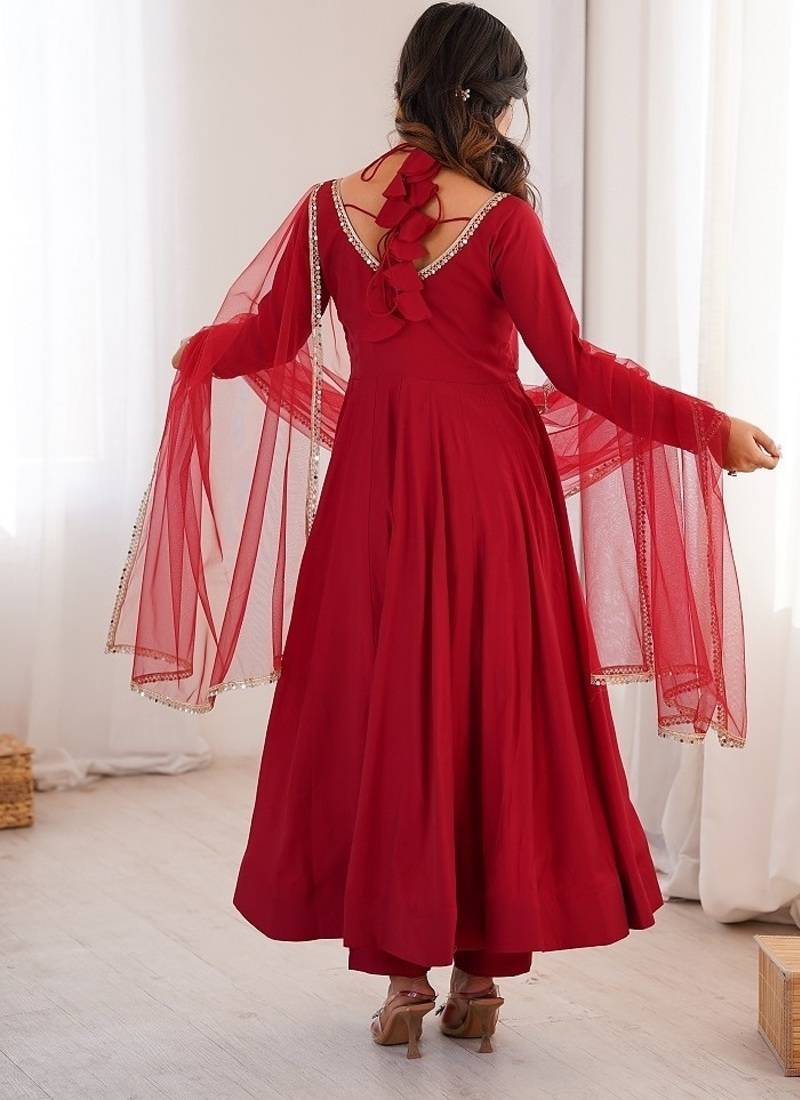Women red ethnic anarkali kurta set for festive & wedding wear stitched