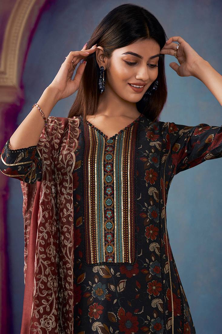 | Product Description | Classic Black Pure Muga Silk Printed Salwar Suit This Suit Has Floral Design Printed To Give A Look Of Signature Party Wear. This Dress Material Has Sushi Silk Maroon, Multicolor Dupatta Well Enhanced With Gota Work And Embroidery Work On Dupatta Borders. |