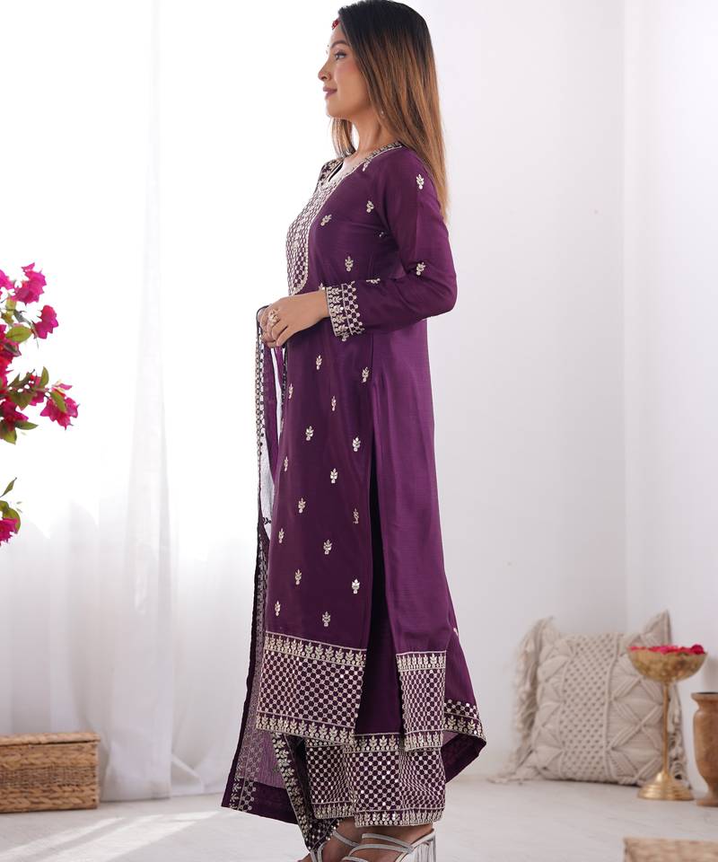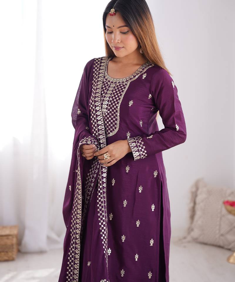 Purple embroidered kurta ensemble with classic elegance stitched
