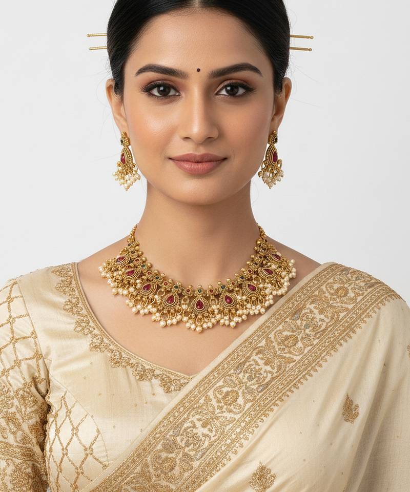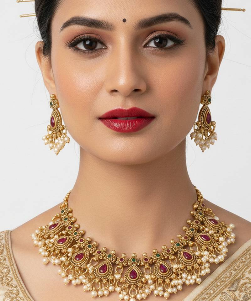 | Product Description | Elevate Your Ethnic Wardrobe With This Stunning Handcrafted Antique Gold Plated Necklace Set. Inspired By Timeless Temple Jewelry Designs, This Set Features Intricate Teardrop Motifs Adorned With Vibrant Ruby Red Stones And Delicate Cluster Pearl Drops. Whether You Are A Bride To Be Or A Wedding Guest, This Masterpiece Is Designed To Make You The Center Of Attention. Key Features
