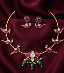 | Product Description | Embrace Nature Inspired Elegance With This Handcrafted Masterpiece Elevate Your Ethnic Wardrobe With Our Stunning Gold Plated Meenakari Parrot And Lotus Necklace Set. This Exquisite Piece Blends Traditional Indian Artistry With Contemporary Design, Featuring A Graceful "Hasli" (Rigid Collar) Style Structure Adorned With Vibrant Motifs. The Necklace Showcases A Series Of Beautifully Enameled Pink Parrots Leading To A Central, Intricate Lotus (Kamal) Pendant Embedded With Sparkling Kundan Stones And Accented With Lush Green Beads. Paired With Matching Bird Motif Stud Earrings, This Set Is A Celebration Of Color And Craftsmanship. Whether You Are Attending A Wedding, A Festive Celebration Like Diwali, Or A Special Family Gathering, This Statement Piece Promises To Be A Conversation Starter. Key Features: Unique Design: Features A Distinct Rigid Collar Adorned With Nature Inspired Parrot And Lotus Motifs, Symbolizing Love And Prosperity. Premium Quality: High Quality Gold Plating With A Polished Matte Finish, Accented By Vibrant Pink Meenakari Enamel Work. Intricate Detailing: Studded With High Grade Kundan Style Stones And Finished With Hanging Green Beads (Dangles) For A Regal Look. Comfort Fit: Lightweight And Skin Friendly Design, Ensuring Comfort For Long Hours Of Wear. Complete Set: Includes 1 Necklace And 1 Pair Of Matching Stud Earrings. Style Tip: