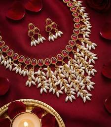 Styling Tip: Pair This Gold Plated Necklace With A Kanjeevaram Silk Saree, A Heavy Embroidered Lehenga, Or A Classic Anarkali Suit. The Rich Red And Green Tones Contrast Beautifully Against Neutral Outfits Like Creams And Golds, Or Match Perfectly With Deep Red And Green Ensembles.