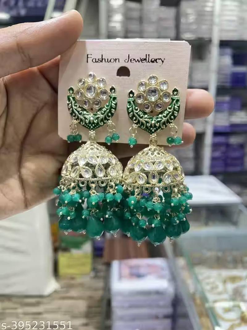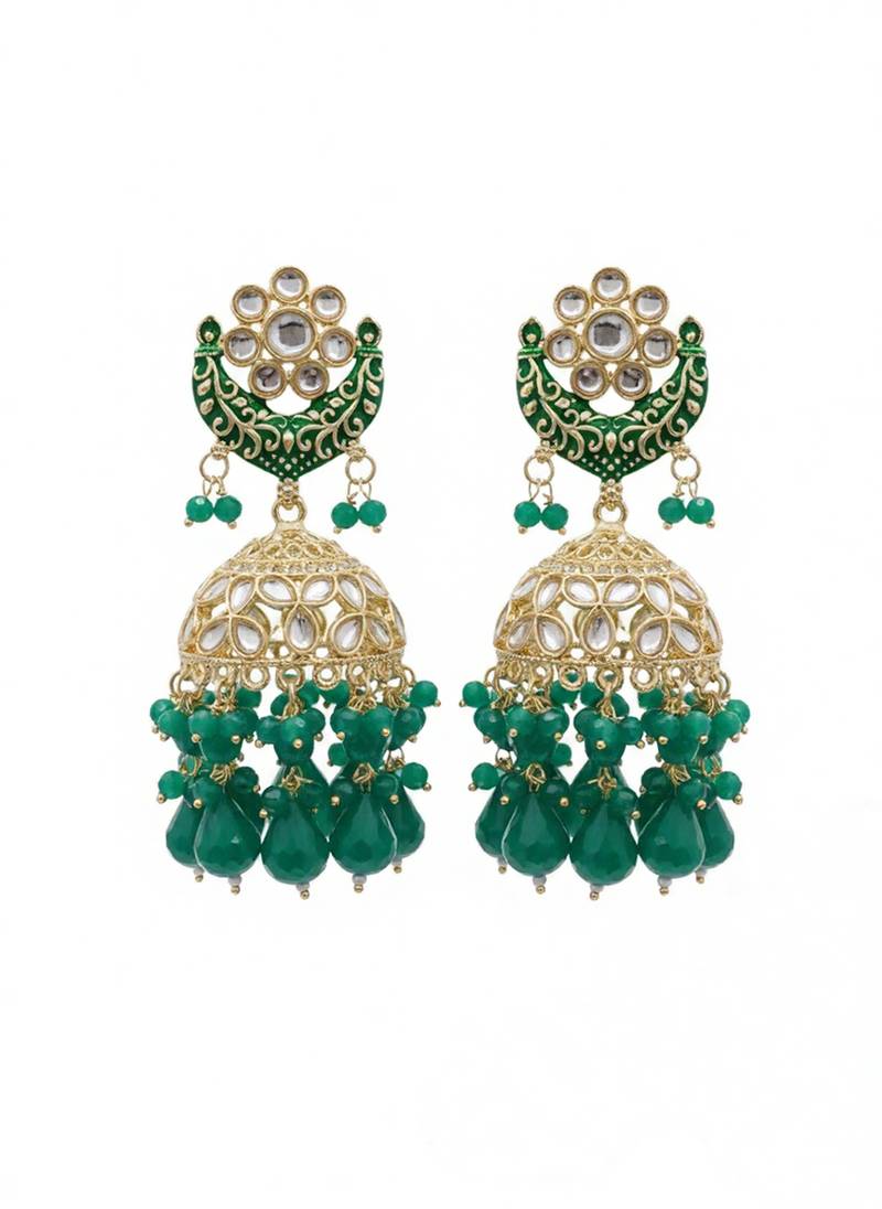 These Stunning Green Jhumka Earrings Feature A Traditional Dome Shaped Design With Intricate Gold Plated Detailing, Shimmering Kundan Style Stones, And Multiple Layers Of Green Bead Drops That Create A Luxurious Chandelier Effect. The Floral Stud Top And Crescent Motif Add A Classic Indian Ethnic Touch, Making These Earrings A Perfect Statement Piece For Women And Girls Who Love Handcrafted, Festive Jewelry.