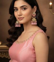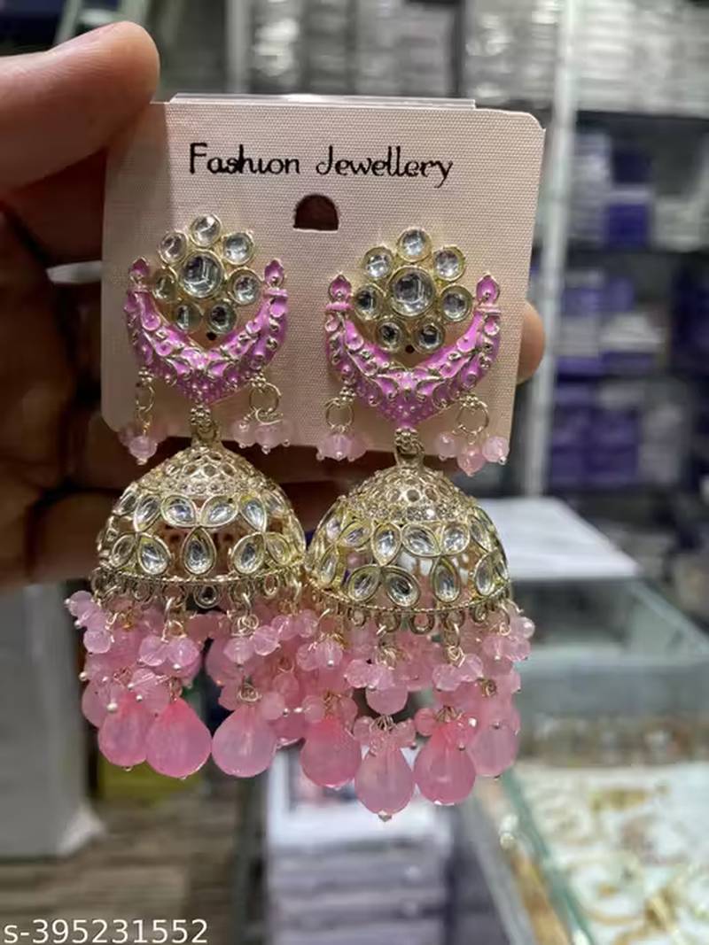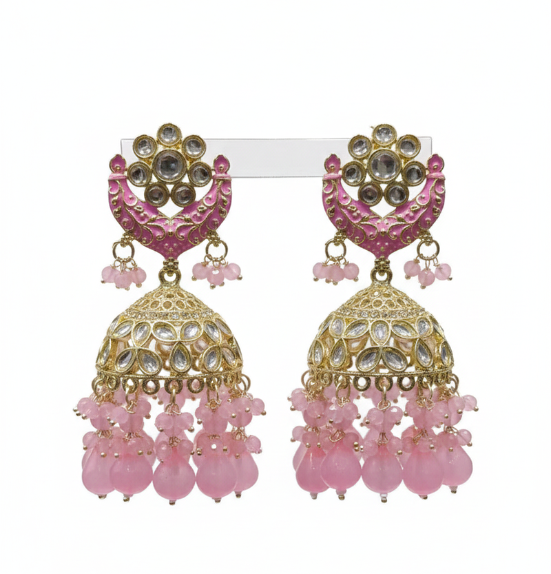 | Product Description | These Stunning Pink Jhumka Earrings Feature A Traditional Dome Shaped Design With Intricate Gold Plated Detailing, Shimmering Kundan Style Stones, And Multiple Layers Of Soft Pink Bead Drops That Create A Luxurious Chandelier Effect. The Floral Stud Top And Crescent Motif Add A Classic Indian Ethnic Touch, Making These Earrings A Perfect Statement Piece For Women And Girls Who Love Handcrafted, Festive Jewelry.