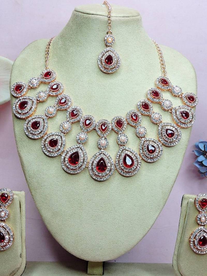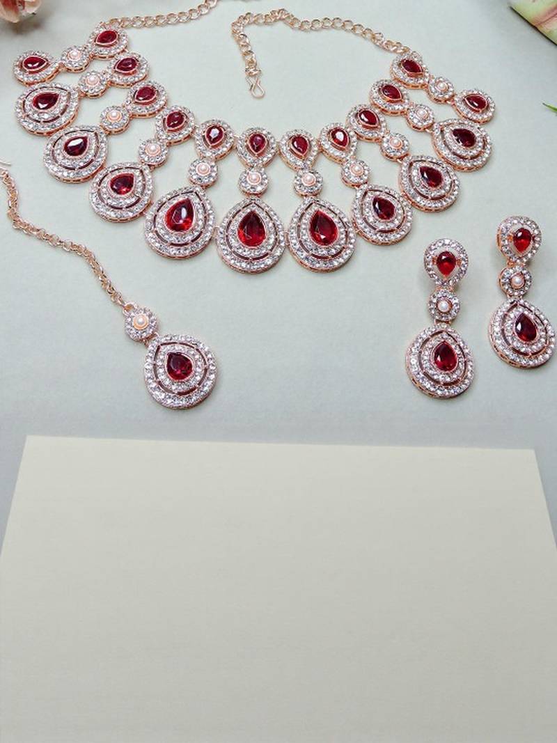 | Product Description | Make A Bold, Glamorous Statement With This Rose Gold Plated Teardrop Shape Stone Necklace Set, Designed To Bring Luxury Sparkle To Every Special Occasion. The Set Includes A Beautifully Crafted Adjustable Necklace, Matching Long Earrings, And A Coordinating Maang Tikka, All Embellished With Teardrop Shape Stones Surrounded By Shimmering White Crystals For A High Impact, Modern Ethnic Look. Perfect For Brides, Bridesmaids, And Party Lovers In India, Usa, Uk, Australia, And Worldwide, This Statement Jewelry Set Pairs Effortlessly With Sarees, Lehengas, Gowns, Cocktail Dresses, And Indo Western Outfits. The Rich Teardrop Shape Stones And Brilliant Cz Style Crystals Enhance Your Neckline And Face, Ensuring You Stand Out At Weddings, Receptions, Sangeet, Engagements, Festivals, And Evening Parties. Key Features