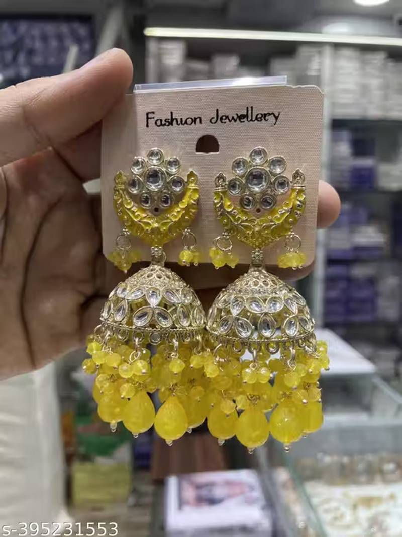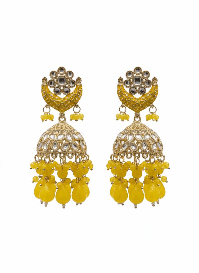 | Product Description | These Stunning Yellow Jhumka Earrings Feature A Traditional Dome Shaped Design With Intricate Gold Plated Detailing, Shimmering Kundan Style Stones, And Multiple Layers Of Yellow Bead Drops That Create A Luxurious Chandelier Effect. The Floral Stud Top And Crescent Motif Add A Classic Indian Ethnic Touch, Making These Earrings A Perfect Statement Piece For Women And Girls Who Love Handcrafted, Festive Jewelry. Crafted From High Quality Alloy With A Rich Gold Tone Finish, These Designer Earrings Are Embellished With Kundan Inspired Glass Stones And Smooth Round Beads That Offer An Elegant Shine. Its Comfortable Fit, So You Can Wear Them All Day During Weddings, Receptions, Sangeet Nights, Diwali, Eid, Navratri, Or Any Special Occasion. Style These Traditional Gold Plated Jhumkas With Sarees, Lehengas, Anarkali Suits, Salwar Kameez, Or Even Indo Western Gowns To Instantly Elevate Your Ethnic Or Fusion Look. The Yellow Color And Sparkling Stones Beautifully Complement Bridal, Bridesmaid, And Party Outfits, Making Them A Great Choice For Festive Gifting To Loved Ones. |