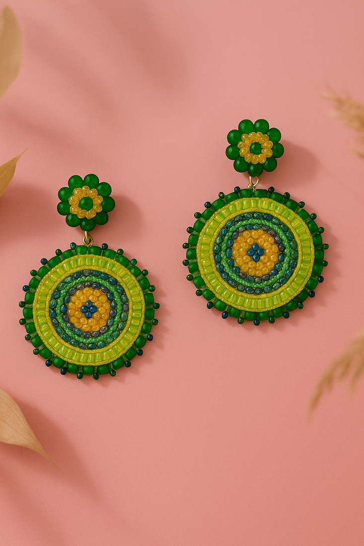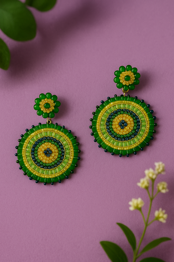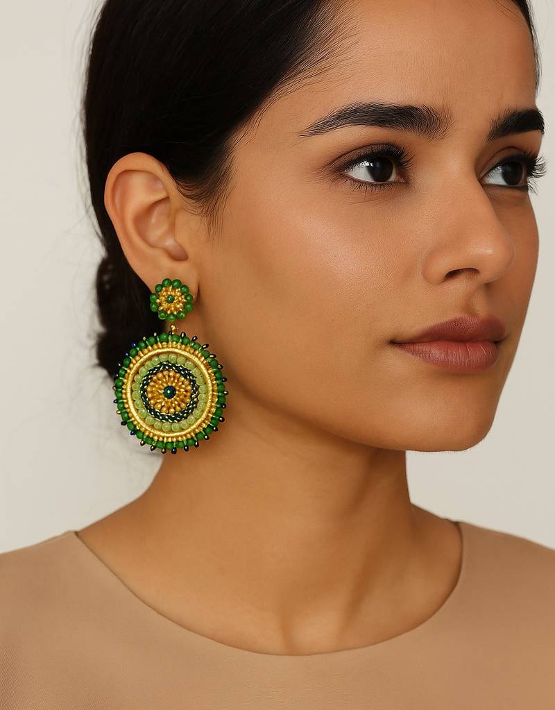 | Product Description | Beautifully Crafted Round Earrings With Green, Gold, And Black Beadwork For A Vibrant, Festive Look. Lightweight And Elegant, Perfect For Weddings, Parties, Or Adding A Pop Of Color To Casual Wear. |