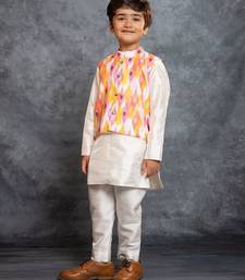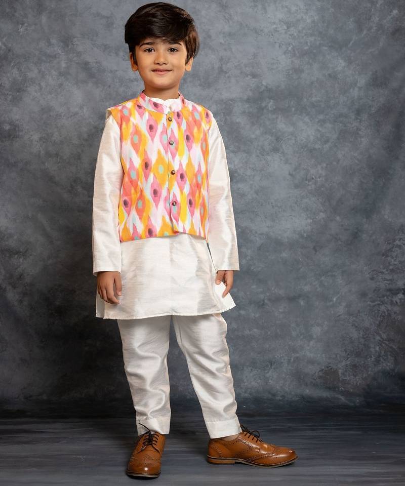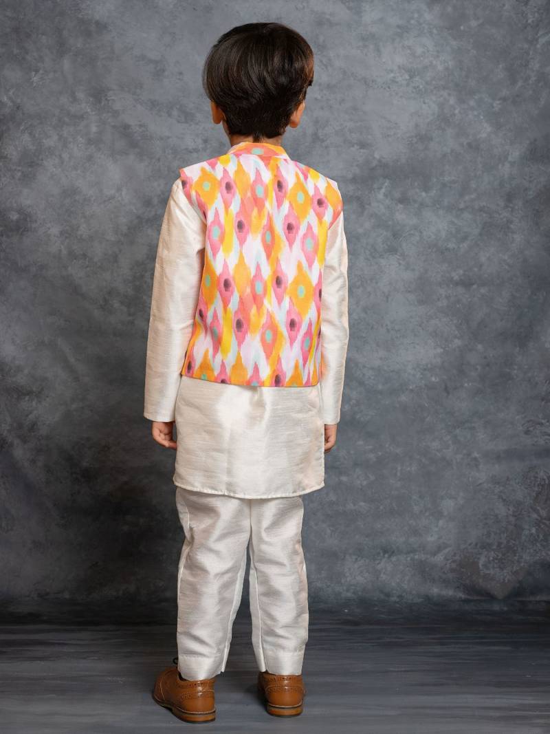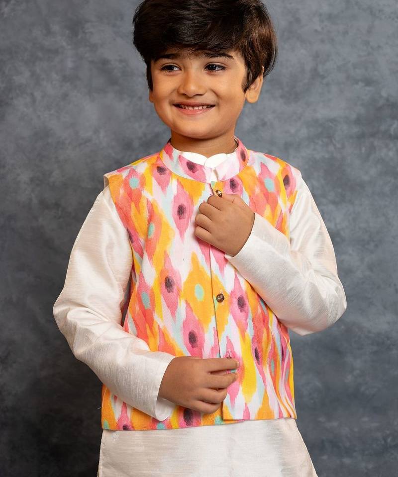 Product Description | This Boys Silk Kurta Pant Set Comes With A Multicolour Printed Jacket. The Luxurious Silk Fabric Ensures Both Comfort And A Rich Appearance. The Digital Print Adds A Modern Twist To Traditional Attire. Ideal Choice For Parties, Family Functions, And Festive Gatherings. A Perfect Ethnic Wear That Makes Your Child Stand Out In Style. |