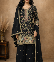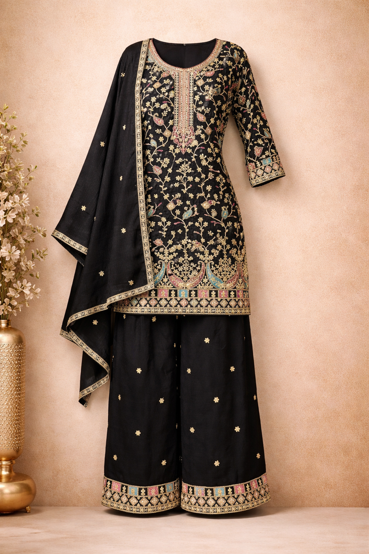 | Product Name | Black Embroidered Chinon Free Size Stitched Palazzo Style Salwar Suit | |
