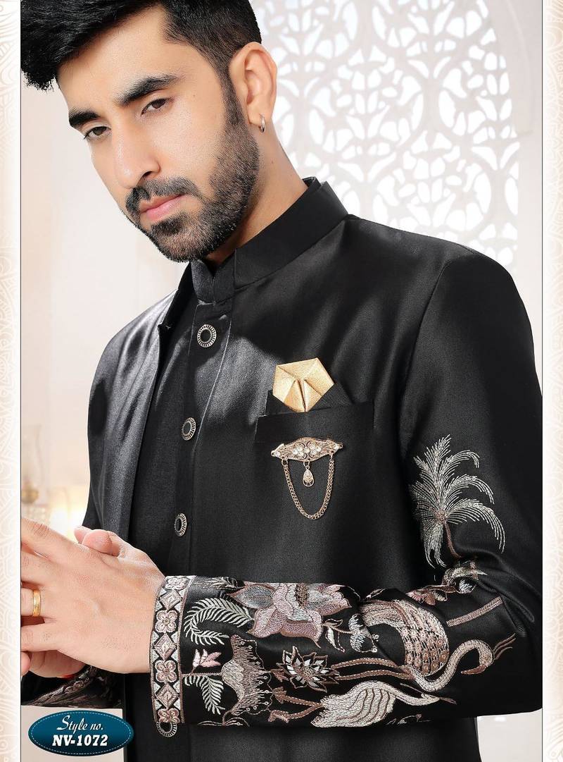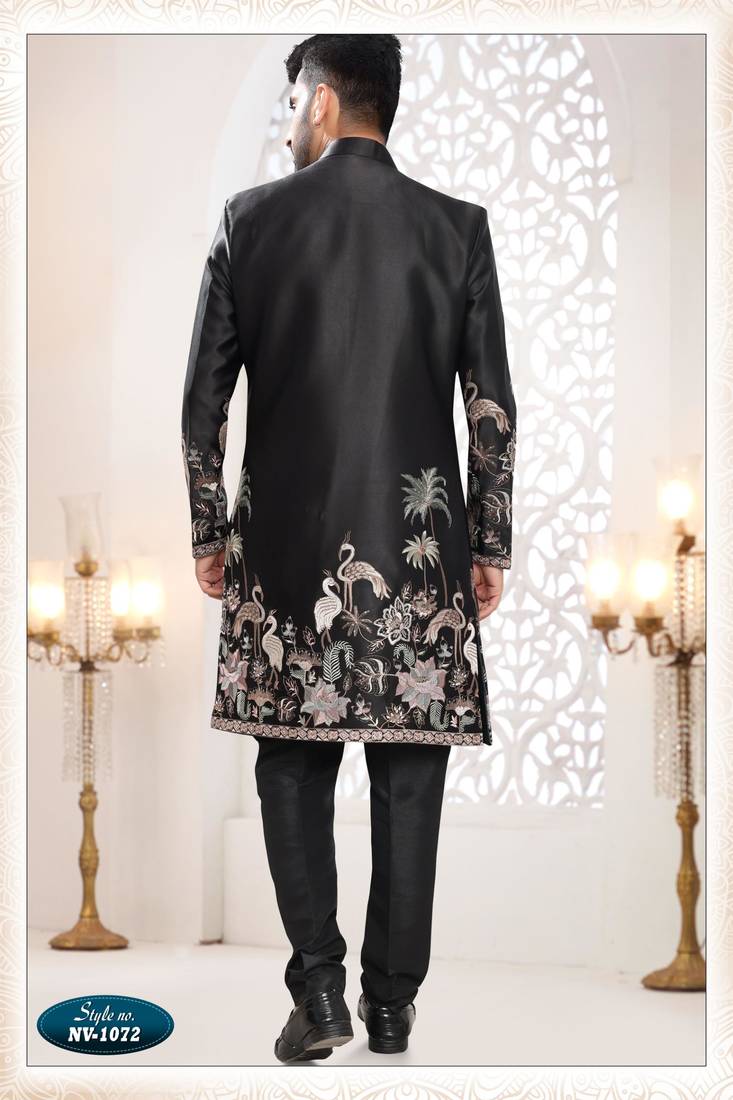 | Product Name | Mens's Black Malai Silk Thread And Sequence Embroidery All Over Indo Western | |