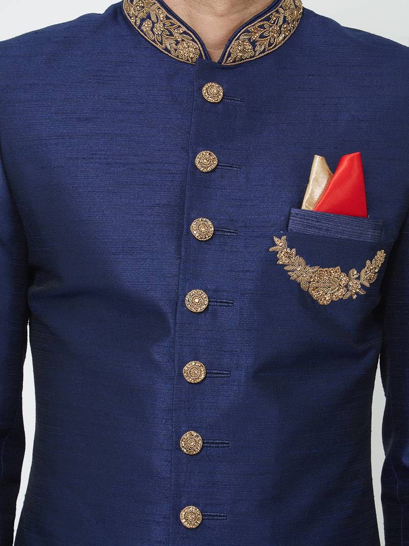 Navy blue art silk straight handwork sherwani for men's