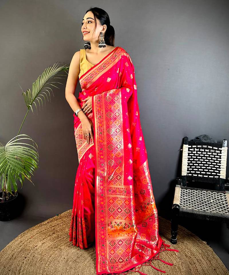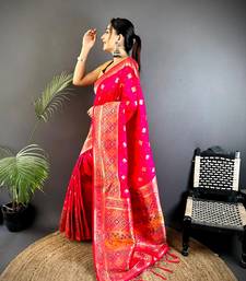 Banarasi lichi silk coral pink meenakari weaving saree with unstitched blouse