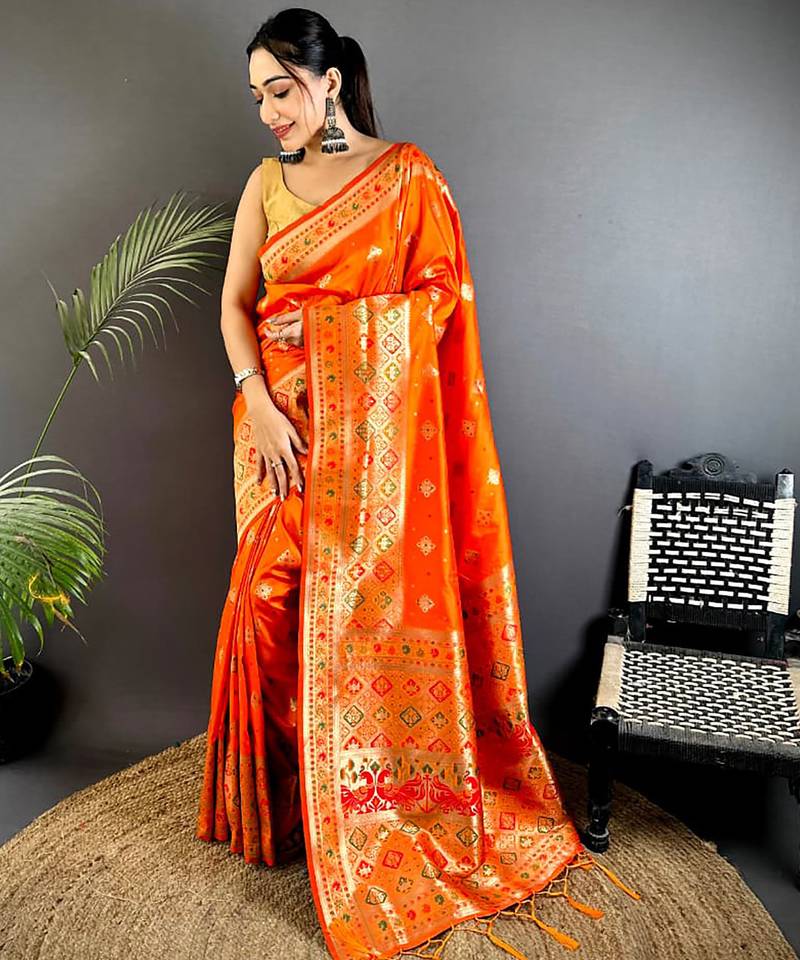 Orange banarasi lichi silk blend orange meenakari weaving saree with unstitched blouse