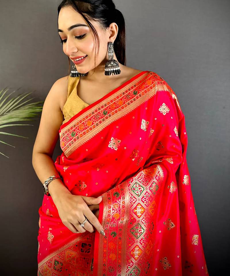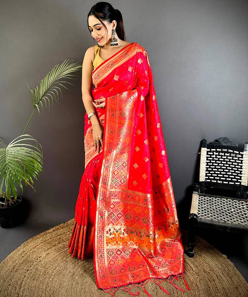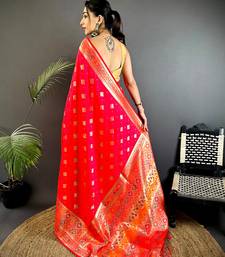 Banarasi lichi silk red meenakari weaving saree with unstitched blouse