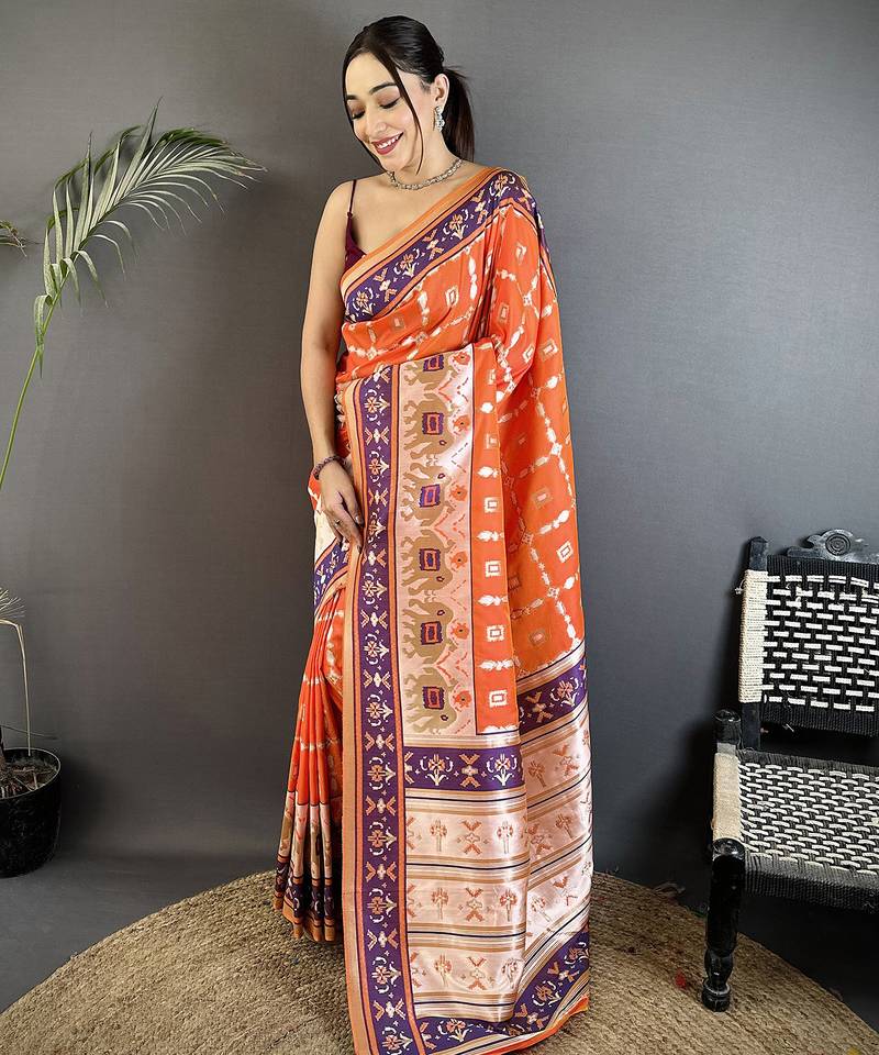 Orange banarasi silk blend orange motifs inspired by nature saree with unstitched blouse